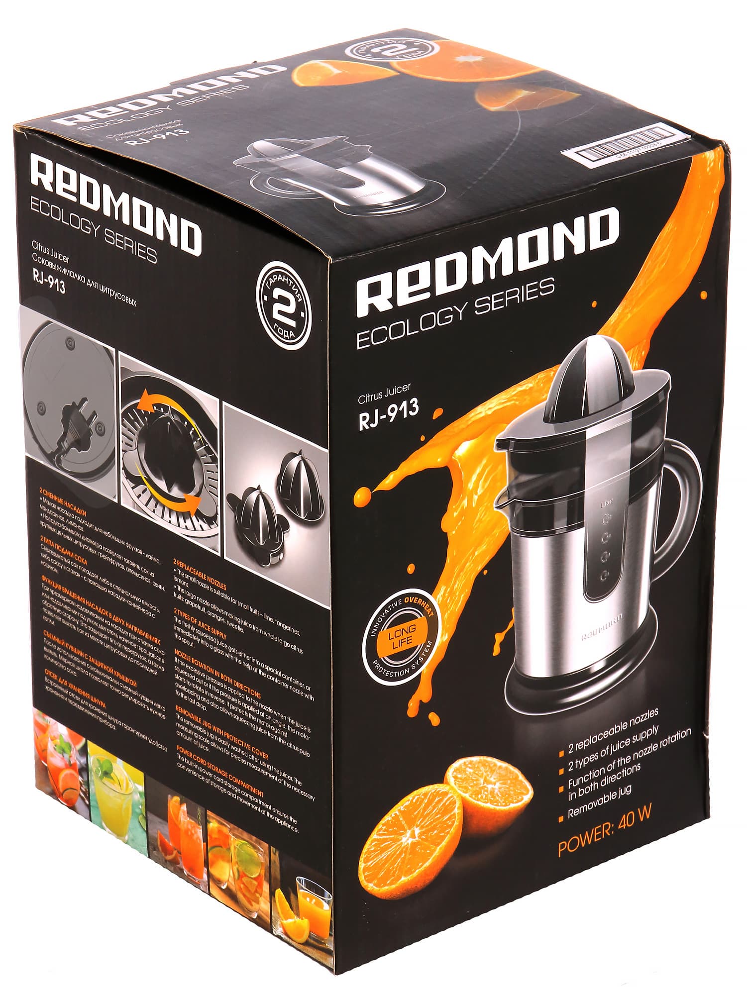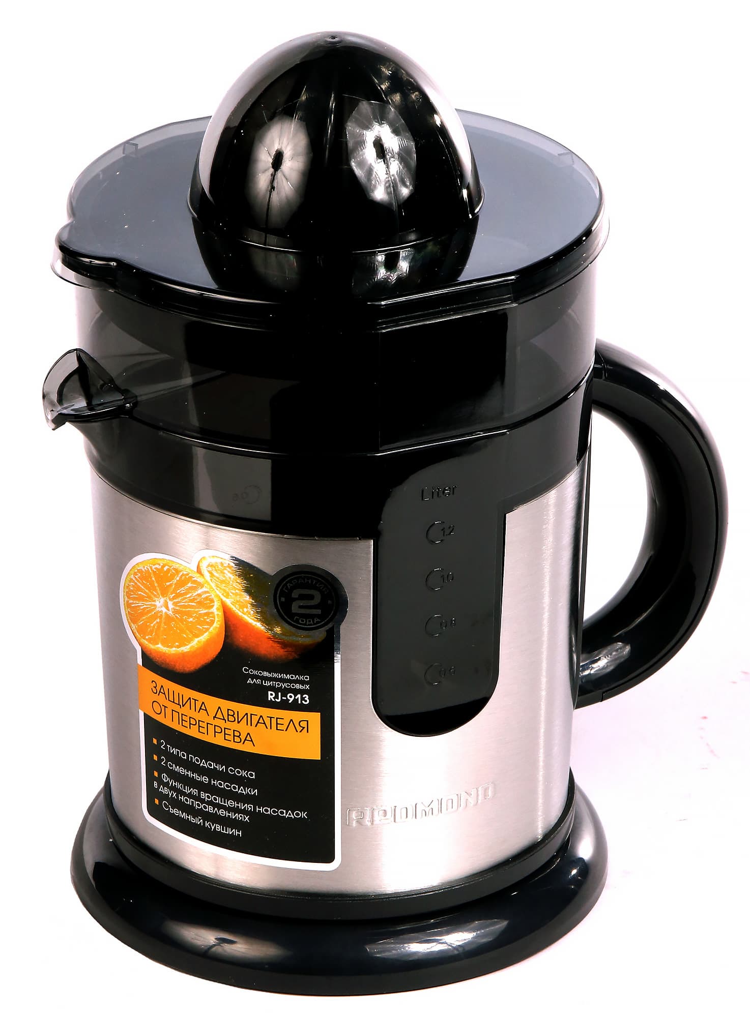 Redmond RJ-913, таким образом, занимает нишу между обычной ручной соковыжималкой для цитрусовых и серьезными соковыжималками, предназначенными для обработки больших объемов продуктов (типа механического пресса или шнековых соковыжималок). Лучше всего она подходит для объемов, при которых отжимать фрукты вручную уже сложно, а применение высокопроизводительной и мощной соковыжималки еще не оправдано.