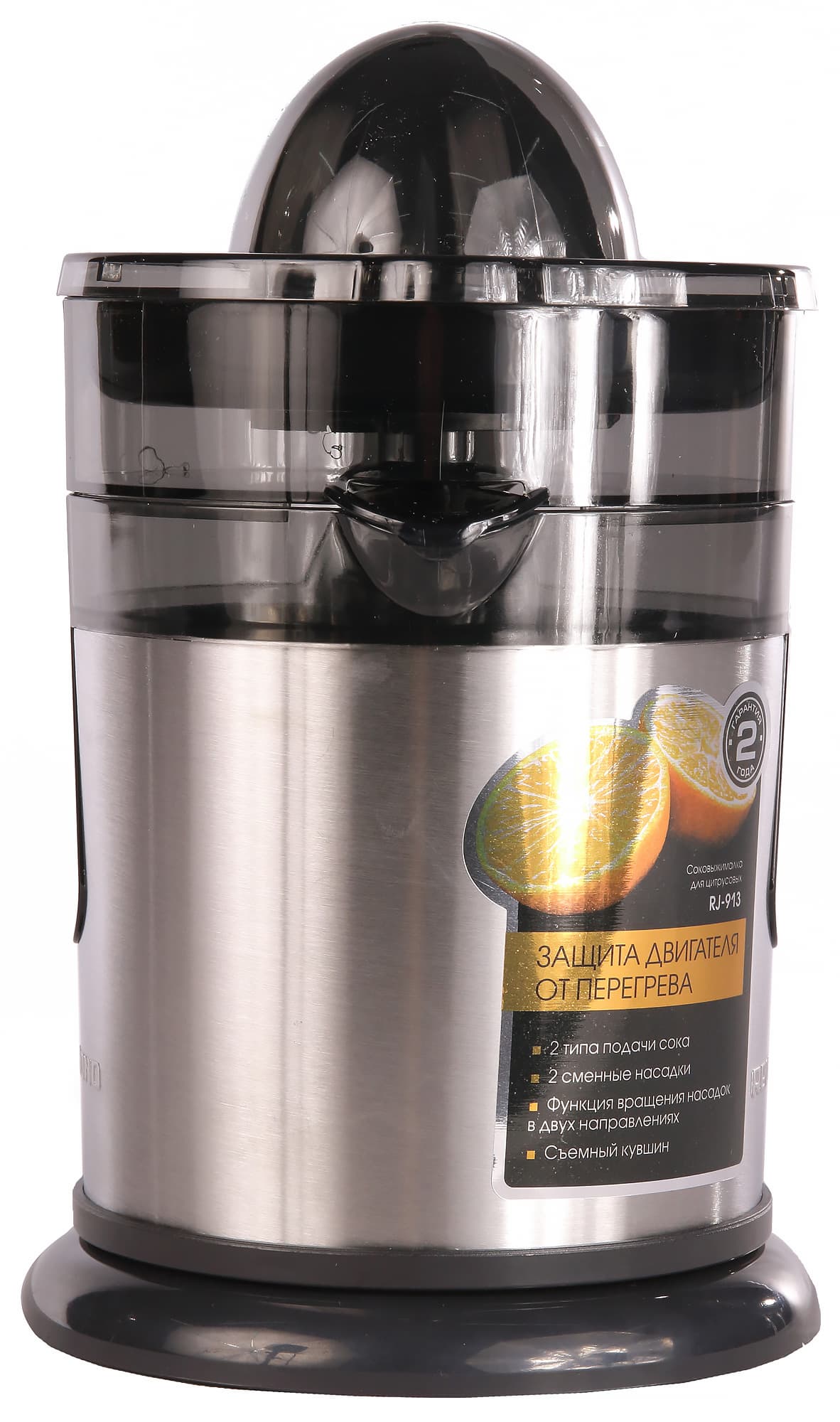 Соковыжималка для цитрусовых RJ-913, выпущенная под брендом Redmond — это компактный прибор, корпус которого выполнен из пластика и нержавеющей стали. Основные особенности прибора — две насадки разного диаметра и возможность подачи сока либо в специальный съемный кувшин, либо сразу в стакан при помощи насадки-контейнера с носиком. Нас же, впрочем, больше интересует другой вопрос: окажется ли заявленных 40 Вт мощности достаточно для полноценного и комфортного отжима сока?