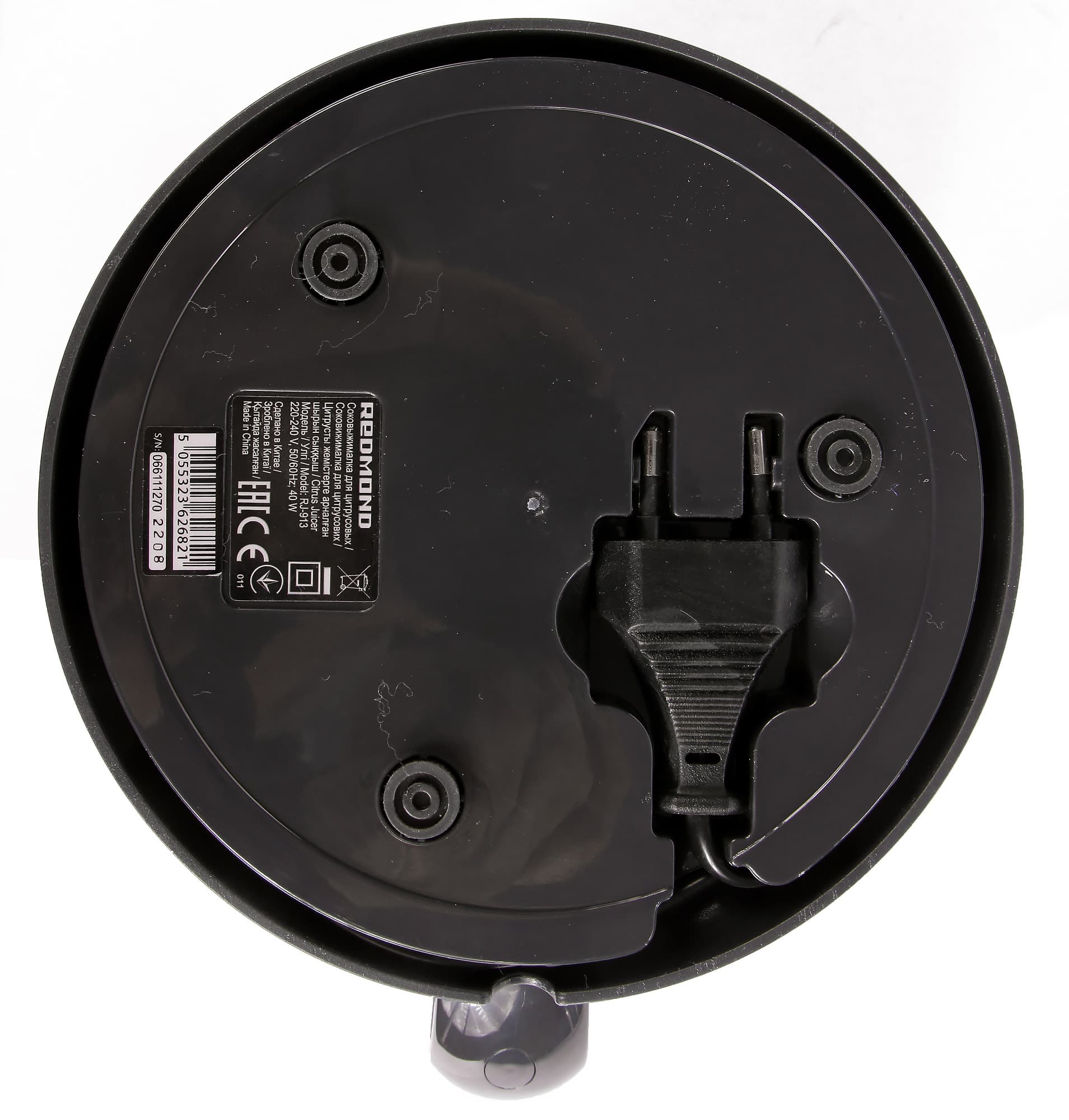 База, она же моторный блок, у нашей соковыжималки пластиковая. Снизу можно увидеть резиновые ножки и отсек для хранения шнура, про который нужно сказать отдельно. Дело в том, что данный отсек позволяет не просто намотать электрический провод, но также спрятать в корпус вилку, для которой выделено специальное место. На наш взгляд, именно так должен выглядеть отсек для хранения шнура во всех без исключения бытовых приборах.