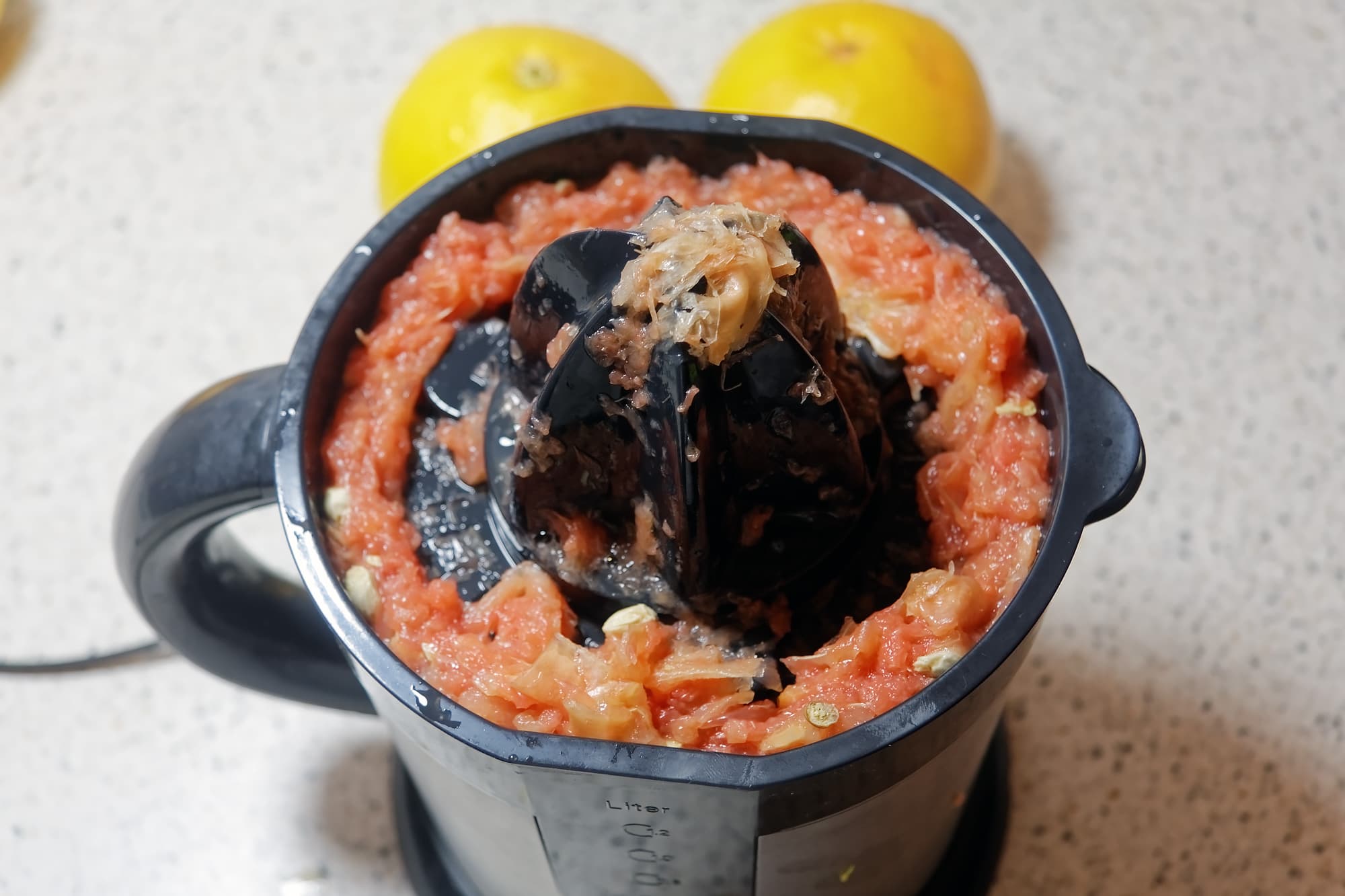 Мы взяли несколько лимонов (их вес составил 520 граммов) и выдавили с использованием малой насадки. Получилось 204 грамма сока. Эффективность не слишком высокая, однако, судя по относительно небольшому объему отходов, виноваты в этом оказались толстокожие лимоны, а не тестируемая соковыжималка.