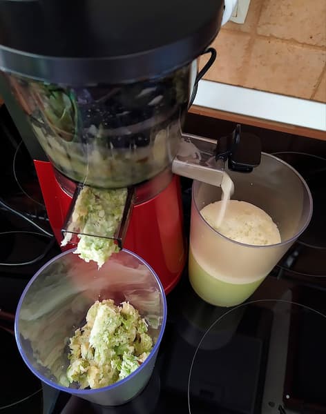 6 минут 47 секунд, 560 граммов, 570 миллилитров, немного пены. Очень своеобразный остро-сладкий вкус, бодрит! А вот жмых очень сочный (опять), да и сока некоторые соковыжималки из того же количества капусты выжимают больше.
