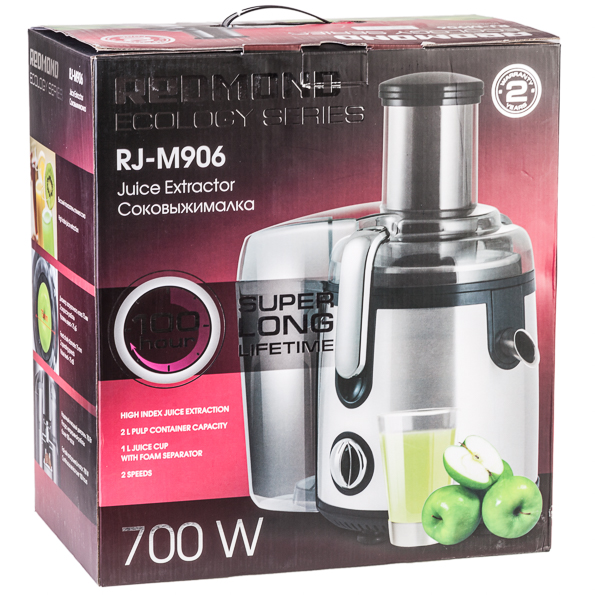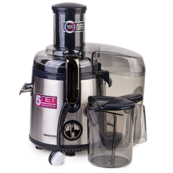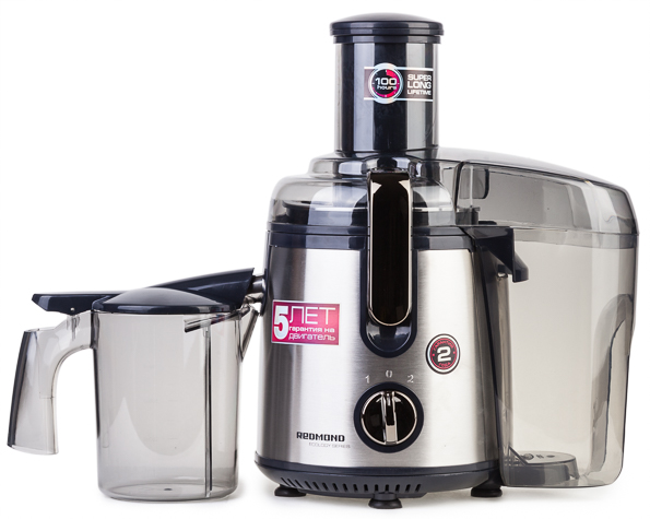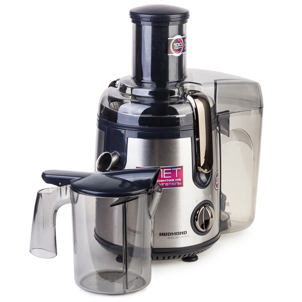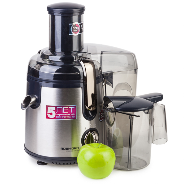Redmond RJ-M906 — весьма изящного вида прибор в металлическом корпусе. Контейнер для жмыха в этой модели крепится к корпусу с помощью прижимной крышки — благодаря этому соковыжималка смотрится компактно. Эта соковыжималка работает с помощью центробежной силы; она может выжимать жидкость из почти любого вида фруктов и овощей. Здесь мы описывали виды и принципы работы разных соковыжималок и наш подход к тестированию таких приборов.
