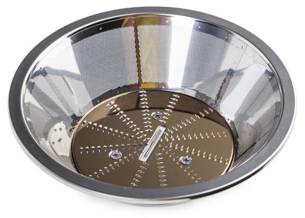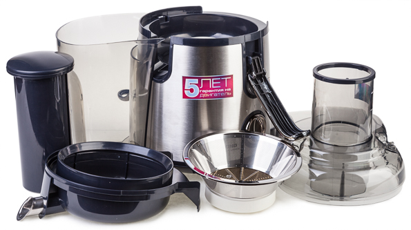 Модель выглядит и ощущается на кухонной поверхности довольно компактной. Помогают этому впечатлению круглый корпус и контейнер для жмыха, плотно крепящийся к корпусу с помощью крышки. Крышка крепится с помощью двух откидных ручек-рычагов. Сетчатый фильтр и чаша сепаратора снимаются простым движением вверх.