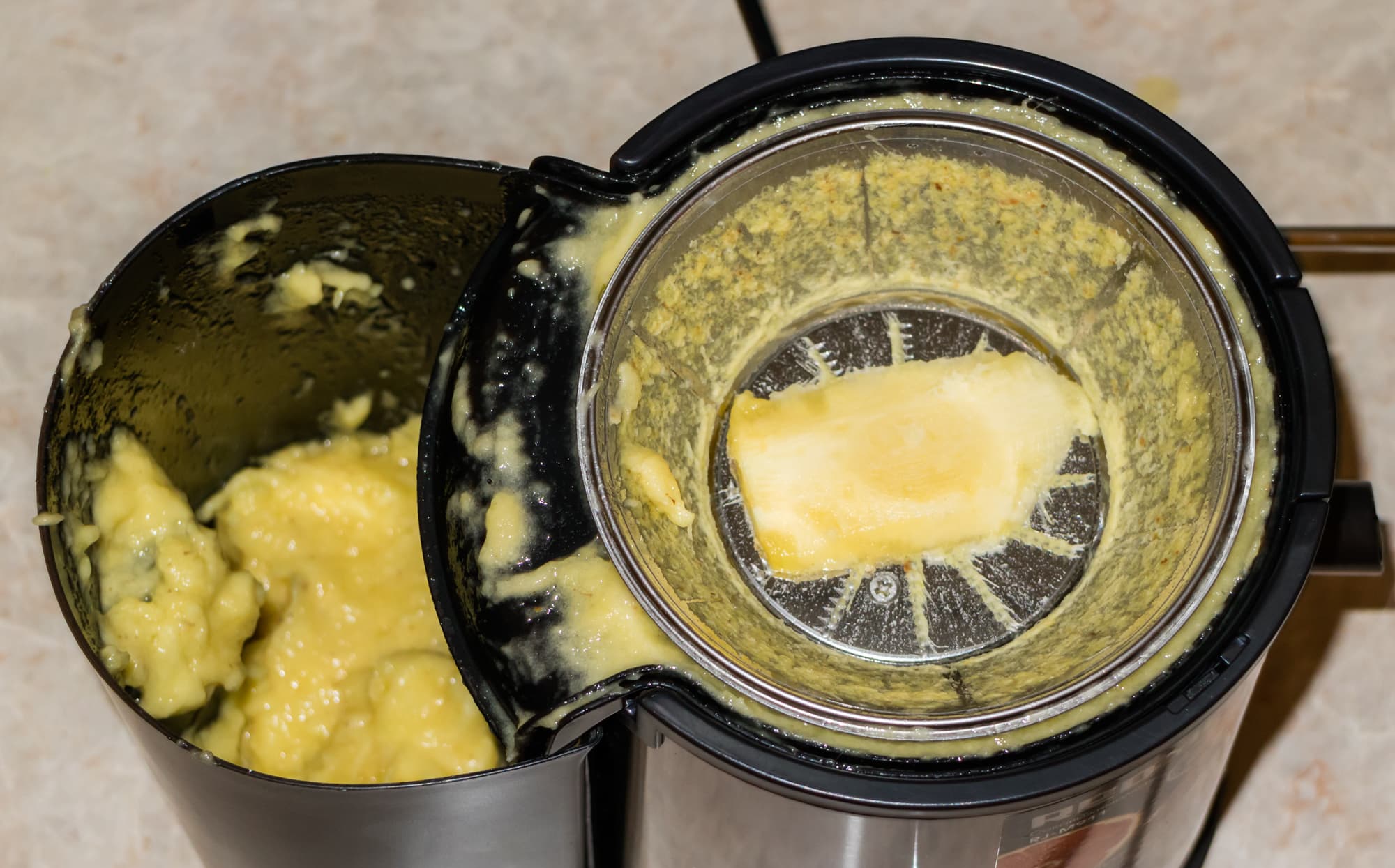 Жмых откровенно влажный, отделяется сок. При разборке соковыжималки в сепараторе был обнаружен непереработанный кусочек ананаса.