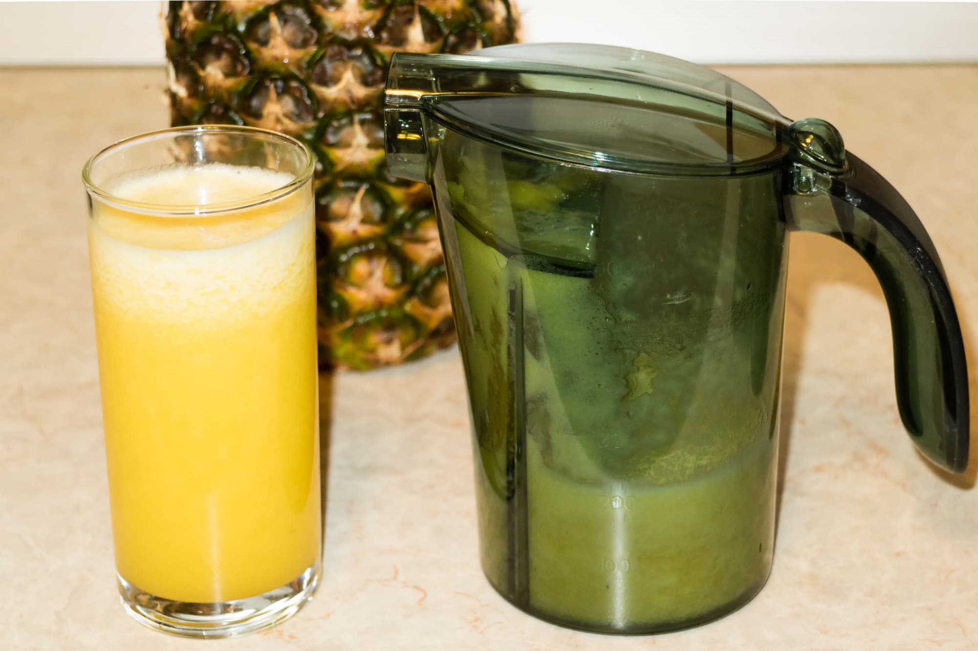 Сок насыщенный по вкусу, хотя и густоватый. Ячейки сетки сепаратора засорились несильно. Несколько смутил нас непереработанный кусок. Выход сока составил чуть менее 50%. Для сложного в переработке ананаса полученный результат можно оценить как средний.