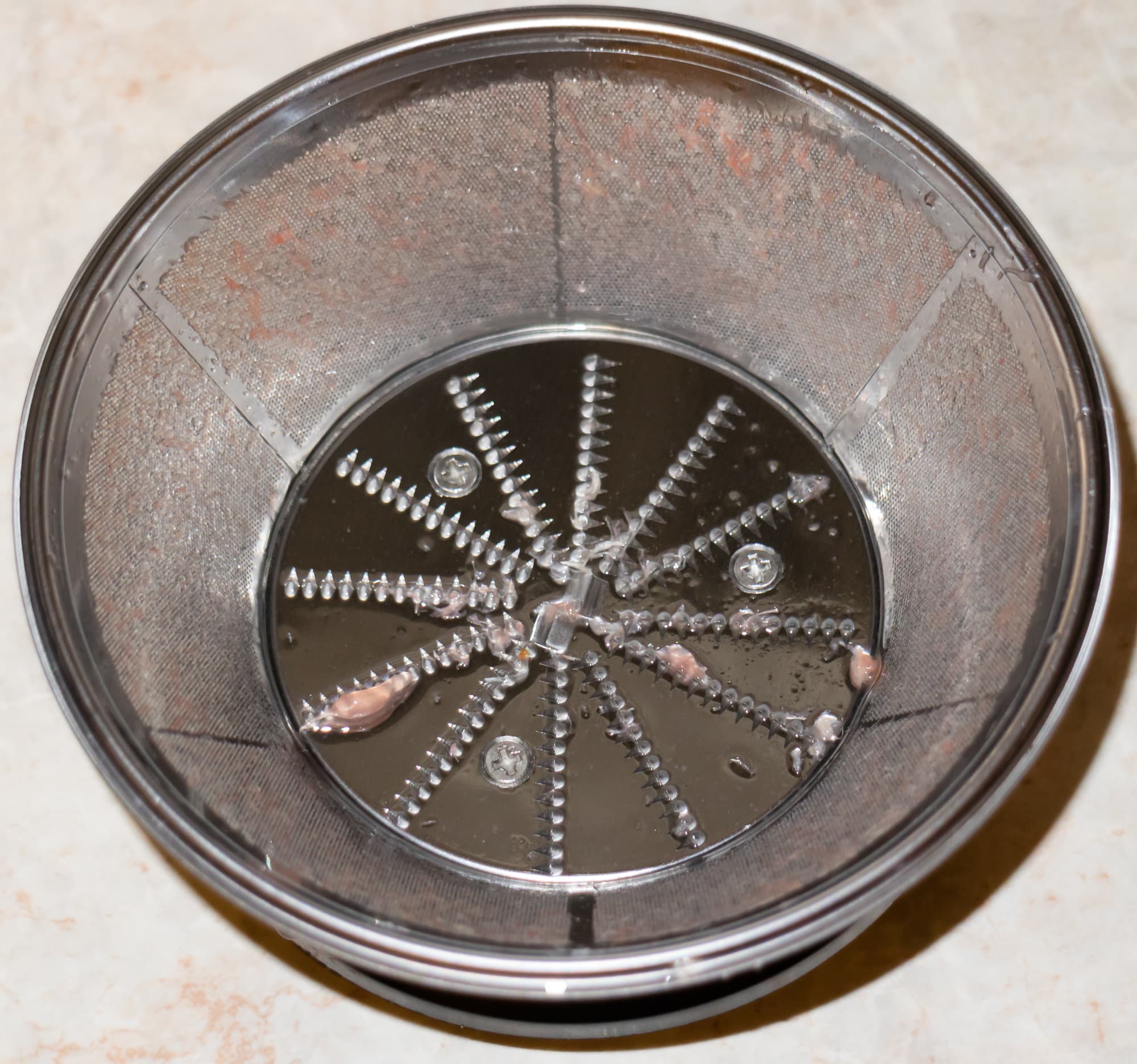 Зато сепаратор после отжима сока из килограмма грейпфрутов оказался значительно чище, чем в предыдущих тестах. Отверстия сетки засорены незначительно.