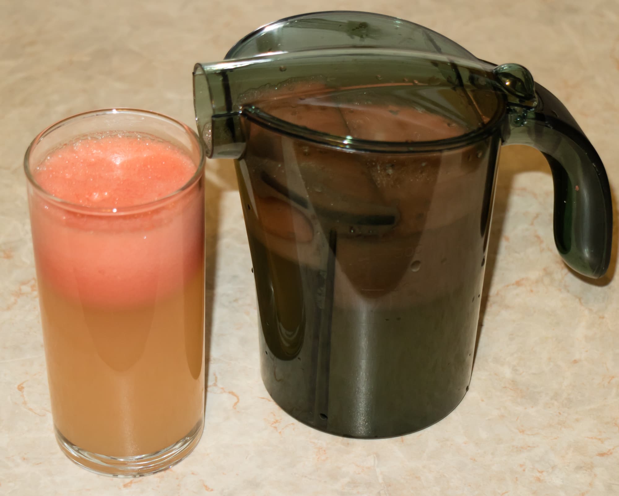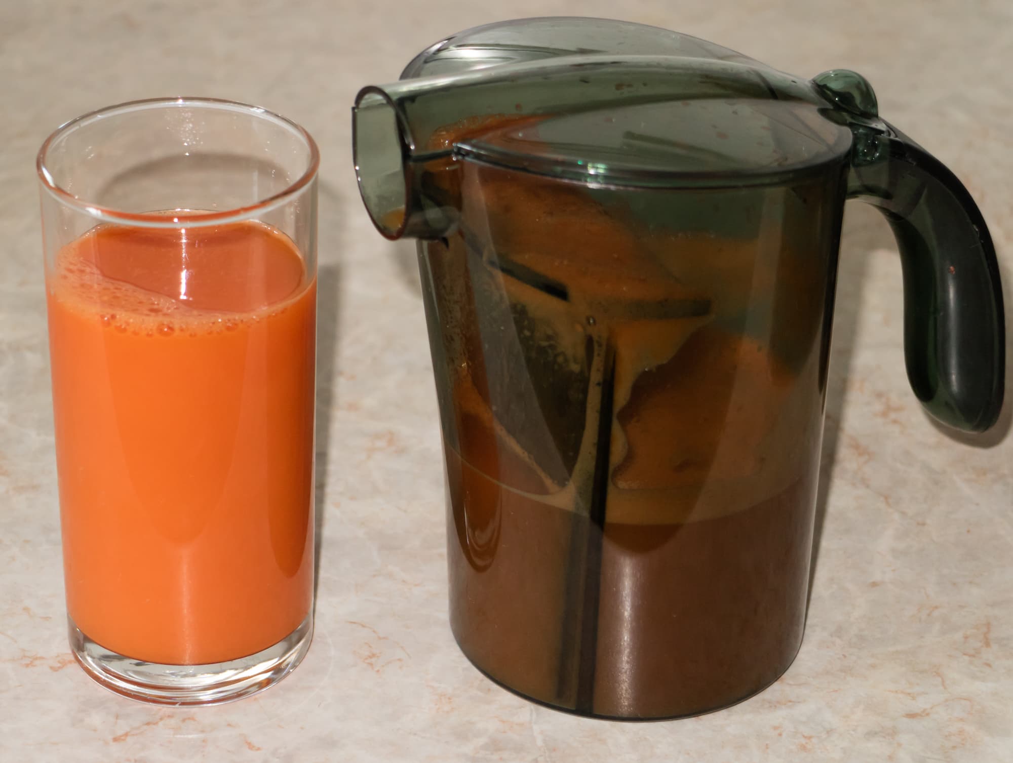 Морковь была нарезана поперек на пятисантиметровые кусочки. Объема кувшина опять не хватило — правда, совсем чуть-чуть. Соковыжималка не нагревалась, гудела с попеременным изменением тона звука. Работа производилась на второй скорости. Сок насыщенного оранжевого цвета получился чистым, без микрочастиц мякоти. Пены еще меньше, чем в первом тесте. При переливании в стакан отсекатель успешно удерживает пену в кувшине.