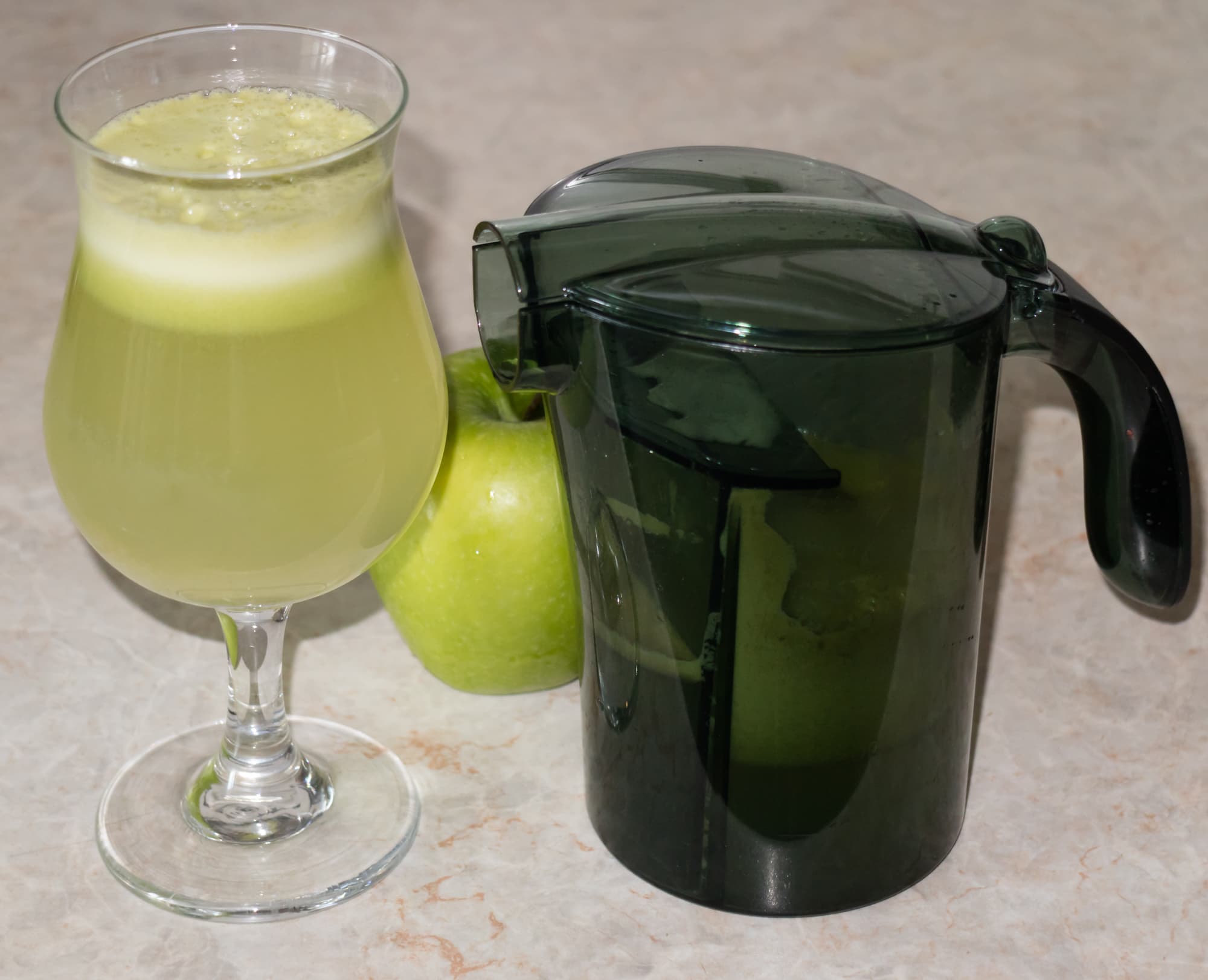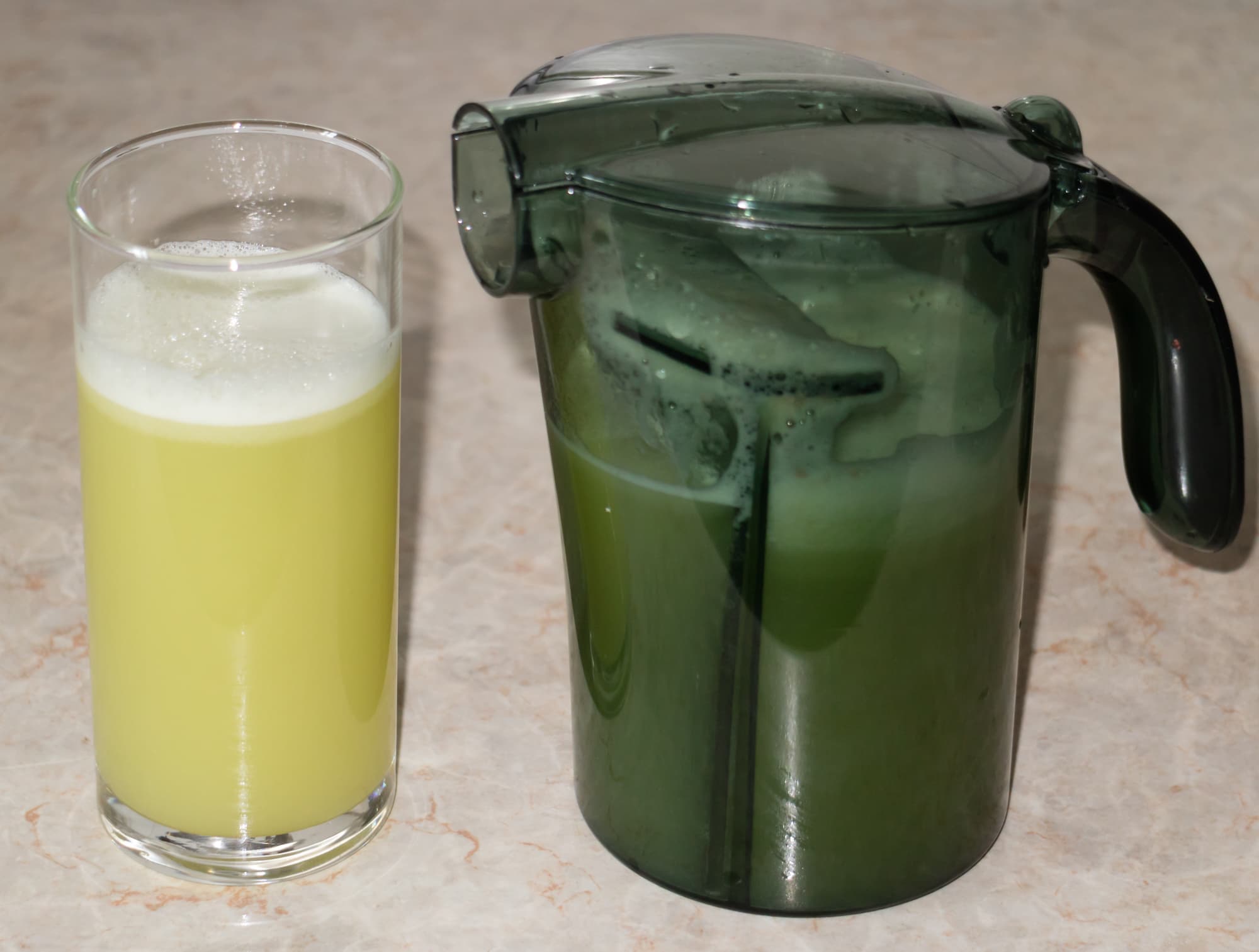 Сок сразу после отжима мутноватый, но буквально за пару минут напиток отстаивается и становится прозрачным. Пены много, даже больше, чем в тесте с яблоками.