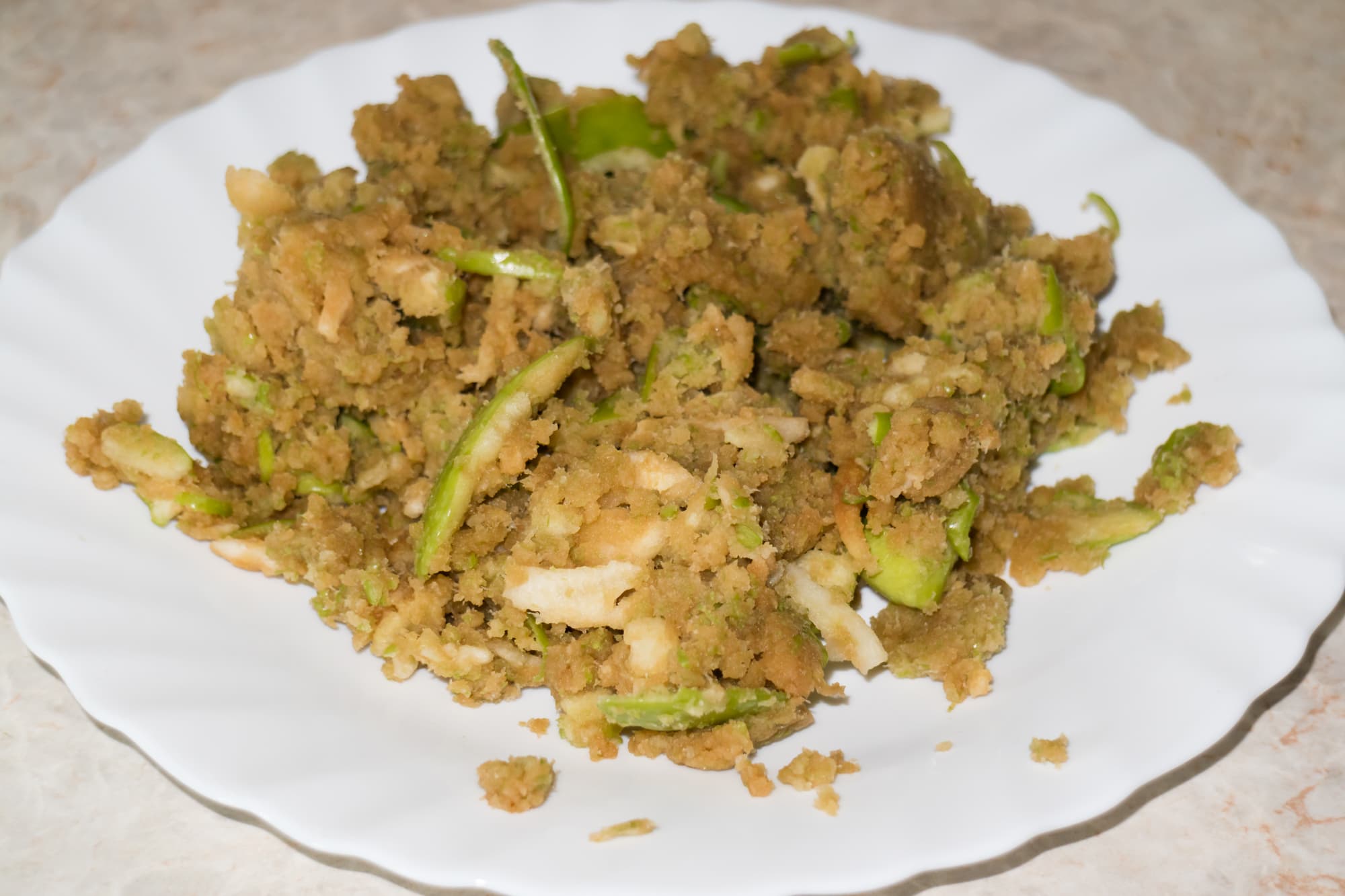 Жмых сухой, сильно неоднородный. Встречаются кусочки шкурки и мякоти яблок.