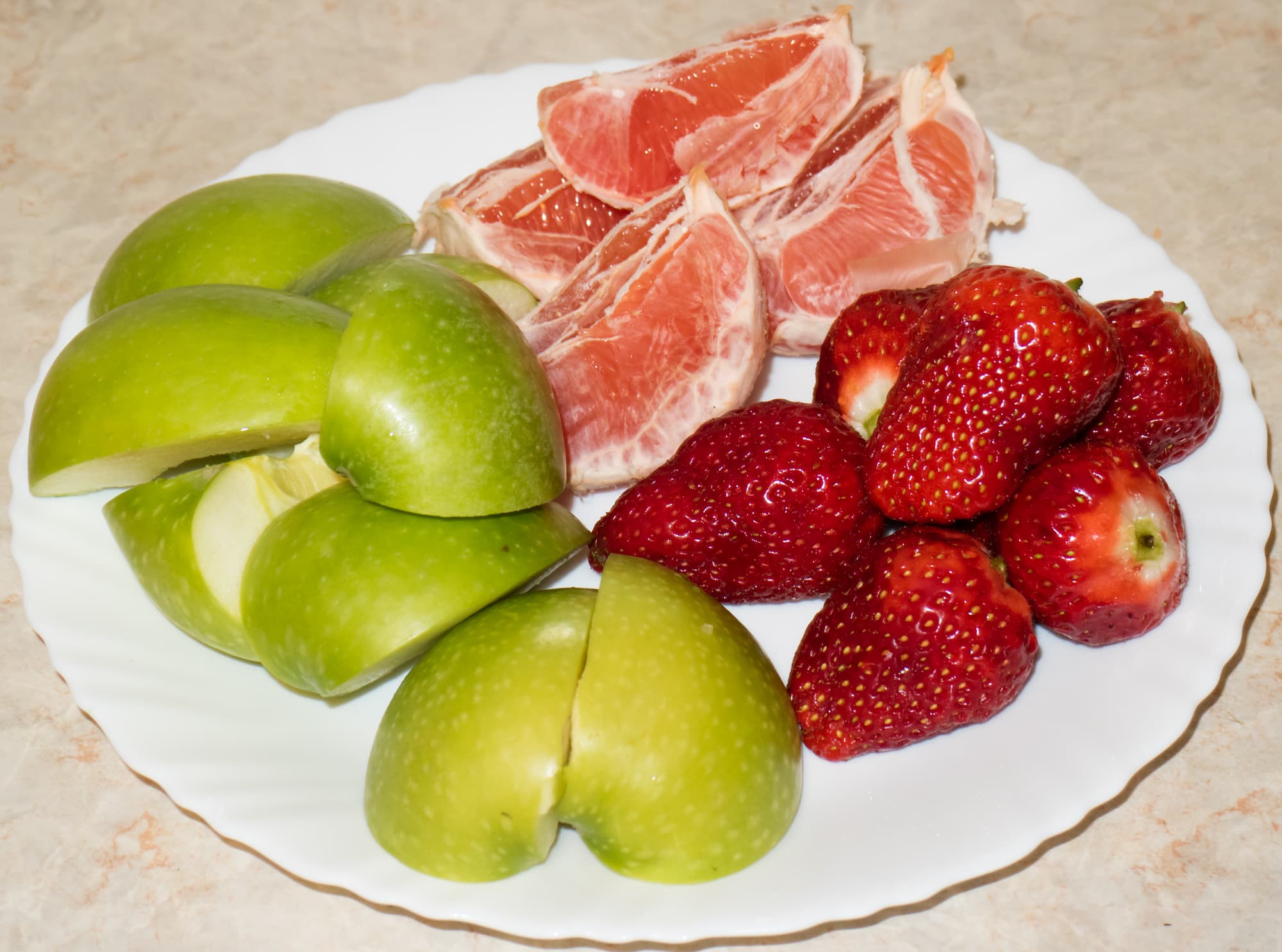 Клубнику вымыли и освободили от листиков, грейпфруты очистили и поломали, яблоки нарезали на дольки и вырезали сердцевину. Вес подготовленного сырья составил 794 г.