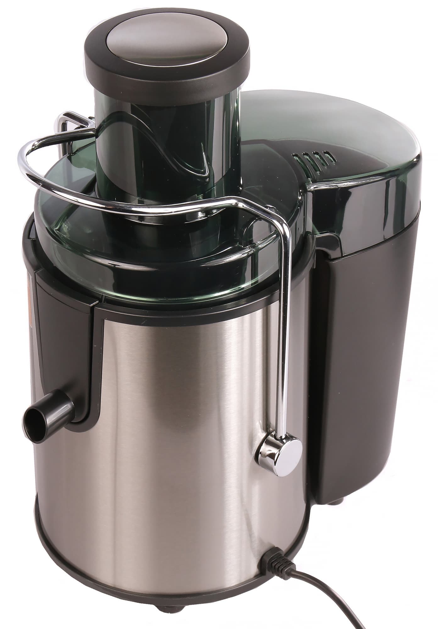 Кувшин для сока сделан из точно такого же затемненного прозрачного пластика, как и крышка камеры подачи продуктов. Внутрь кувшина вставляется пеноотсекатель. Емкость оснащена носиком для облегчения слива сока. По официальной информации, объем кувшина составляет 750 мл. Однако фактически рабочий объем емкости — не более 600 мл. Кстати, нанесенные на боковой стороне отметки объема заканчиваются ровно на этой цифре. Ручка удобно располагается в руках.