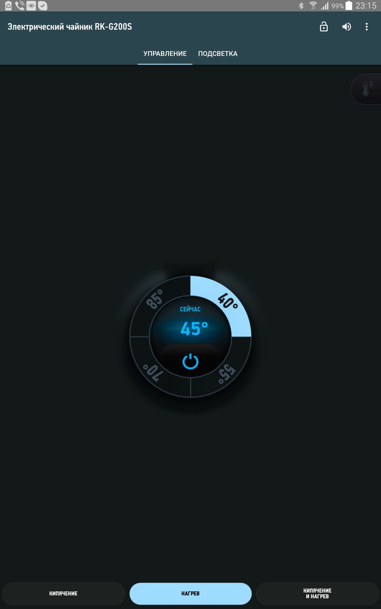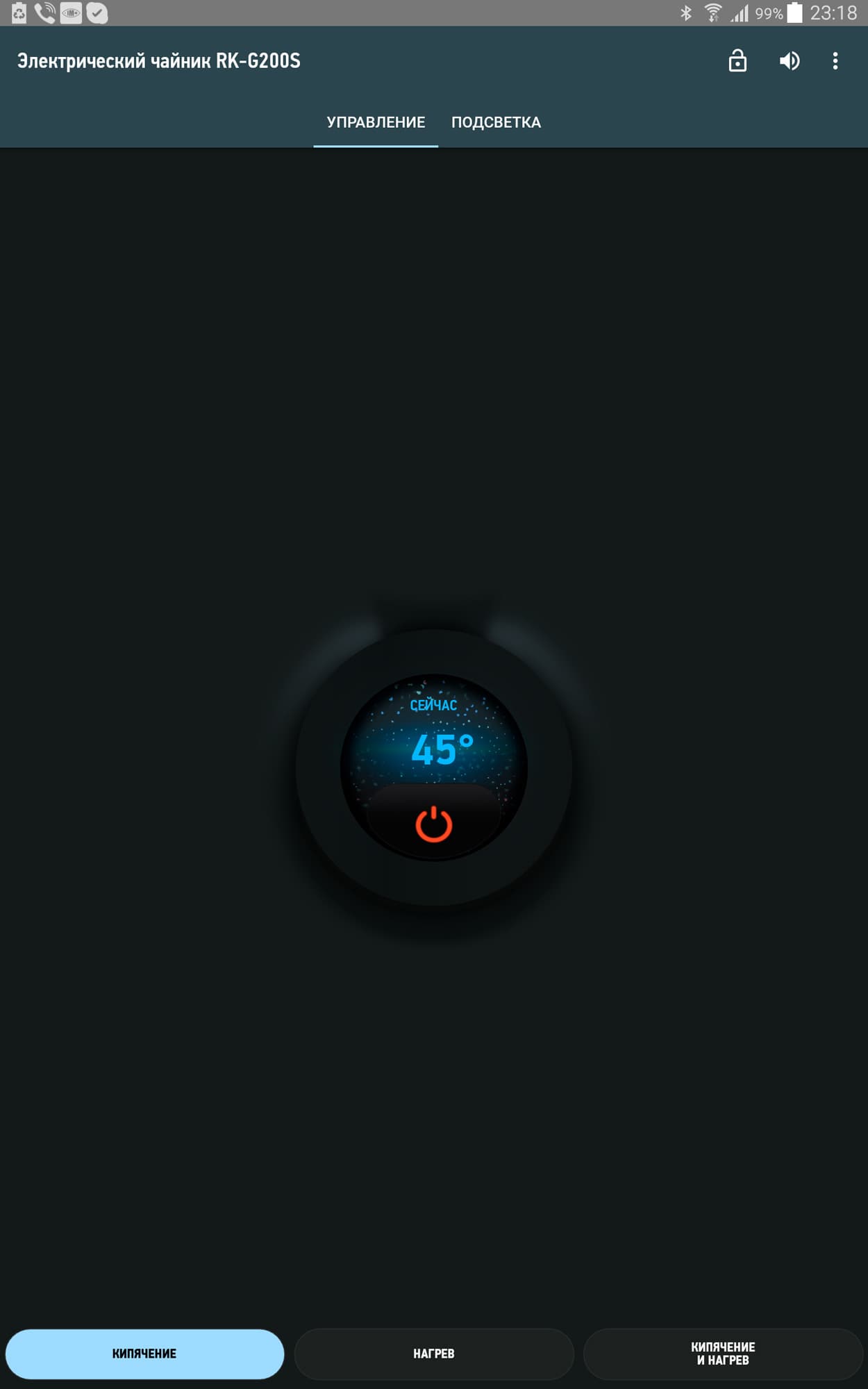Изображения замка и динамика в верхней правой части экрана тоже являются кнопками, они позволяют со смартфона заблокировать/разблокировать кнопки на чайнике, а также включить/выключить звуковое оповещение об окончании процесса.