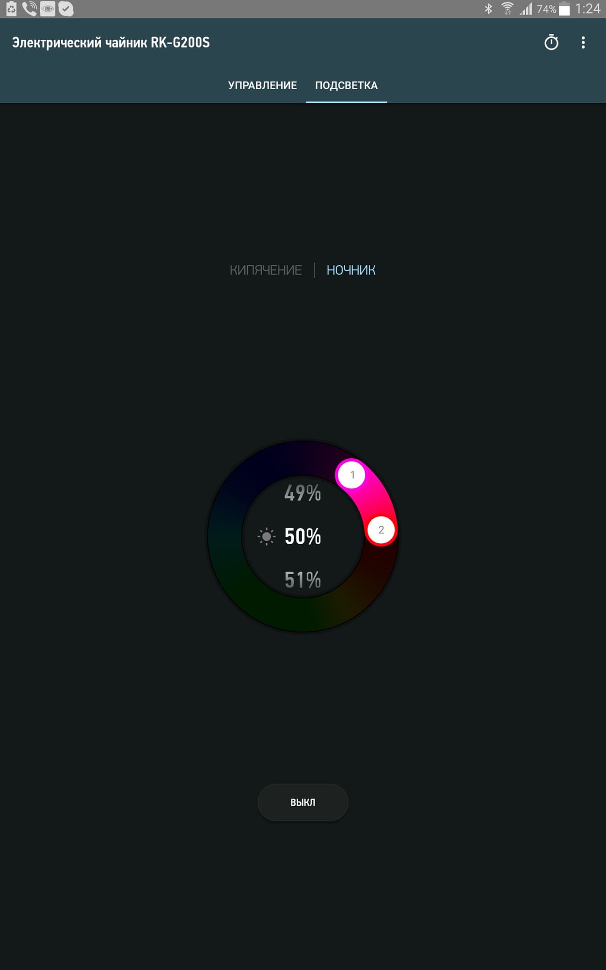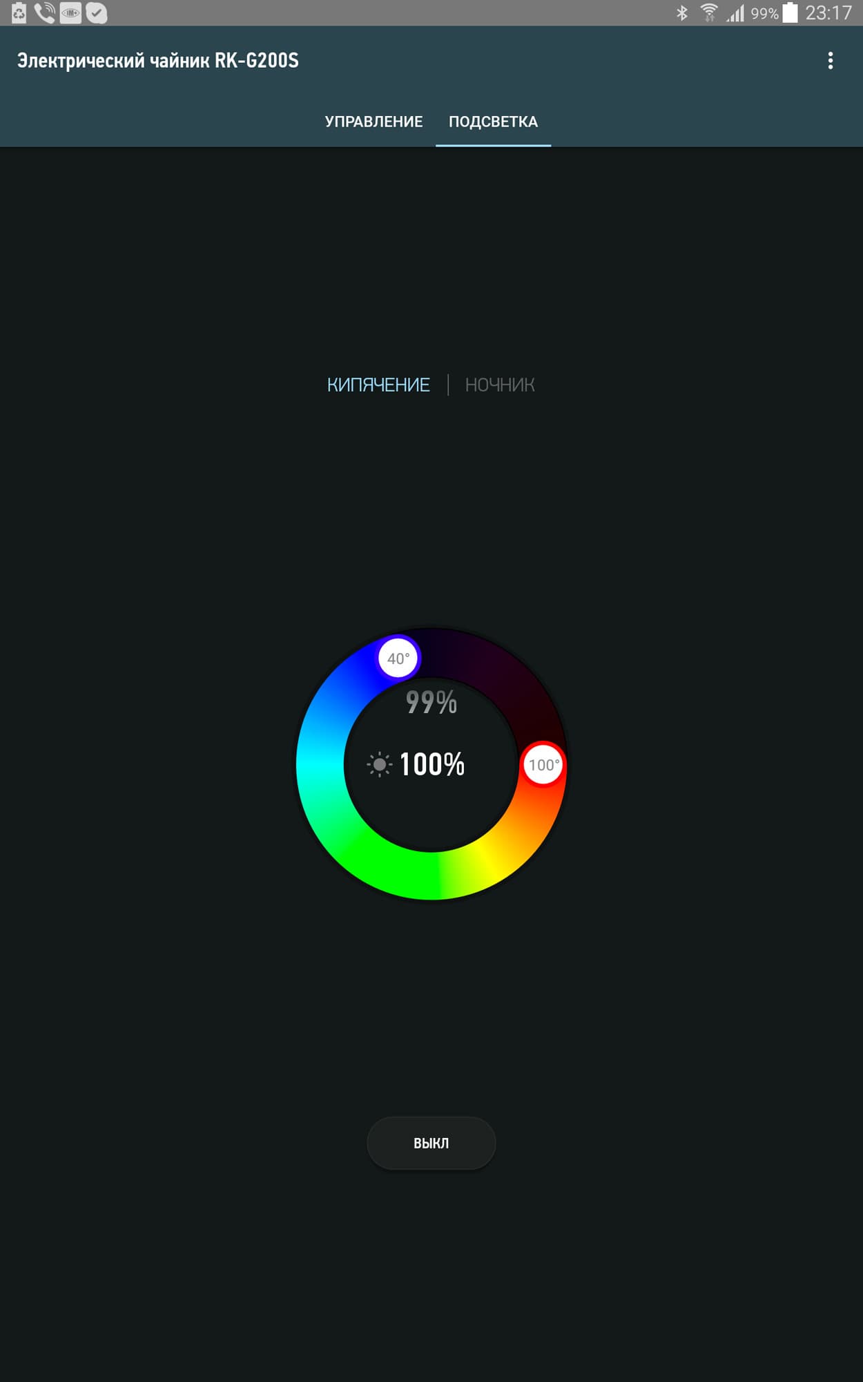 Отдельная закладка выделена на управление подсветкой, и вот тут мы, честно говоря, поняли не все. Теоретически (как нам показалось логичным) выставление двух точек температур и соответствующих им цветов должно приводить к работе подсветки на самом чайнике, аналогичной той картинке, которая отображается на экране планшета. Проблема в том, что в реальности этого не происходит, по крайней мере в режиме кипячения.