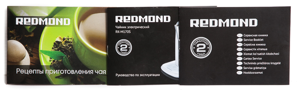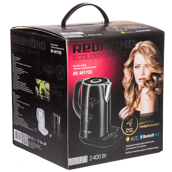 Чайник поставляется в картонной коробке, оформленной в стандартном стиле Redmond: черно-красная цветовая гамма, лицо «современного человека» или «человека будущего» (на этот раз это барышня в самом обычном наряде, без каких-либо космических шлемов или тому подобных вещей). От ударов содержимое коробки защищено картонными вкладками (большего и не требуется). Для удобства переноски предусмотрена специальная пластиковая ручка.