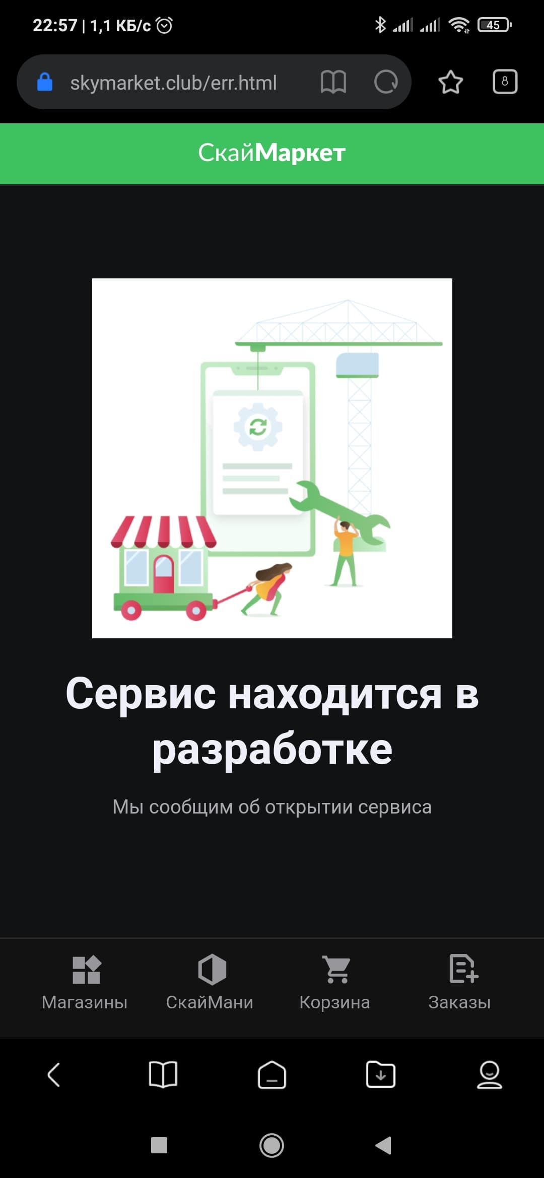 А вот функция покупки воды, продуктов или техники из R4S все еще не работает. При нажатии на соответствующие «кнопки» в браузере открывается сайт «Скаймаркета», там мы видим ссылки на известные службы доставки, но при попытке перейти по ним загружается уже знакомая нам картинка.