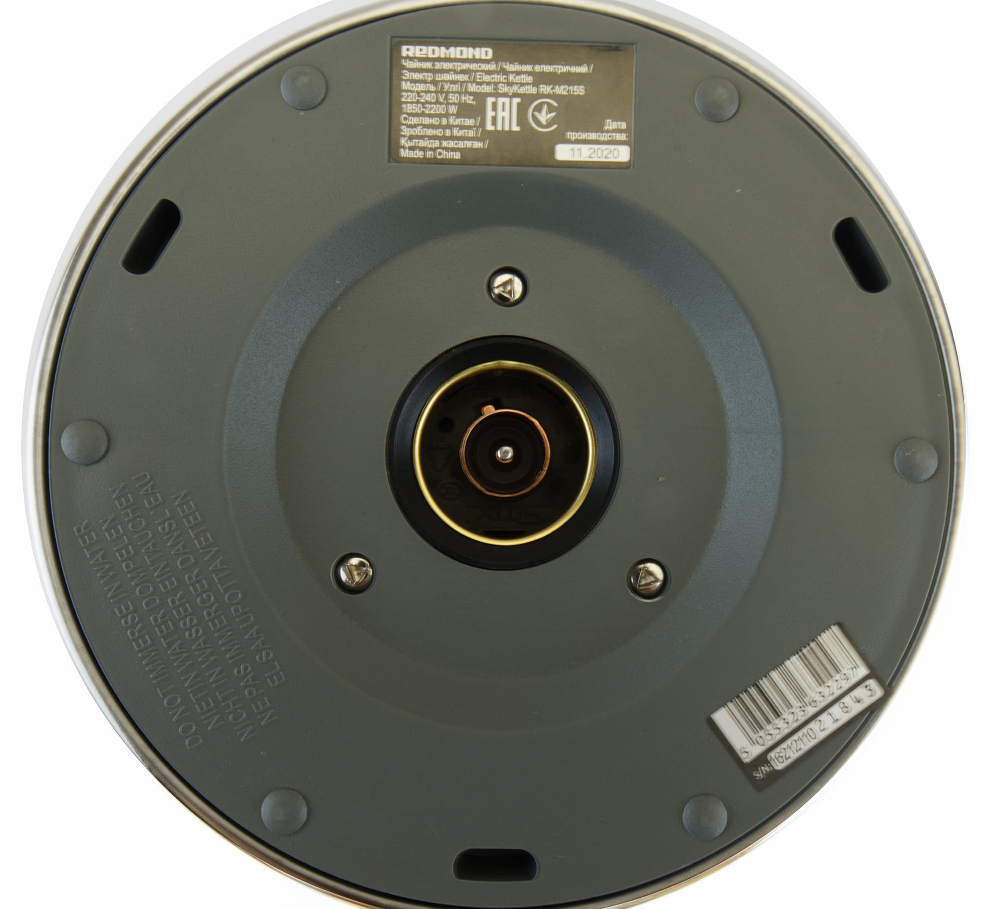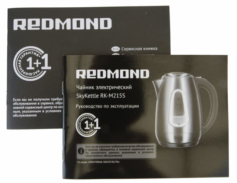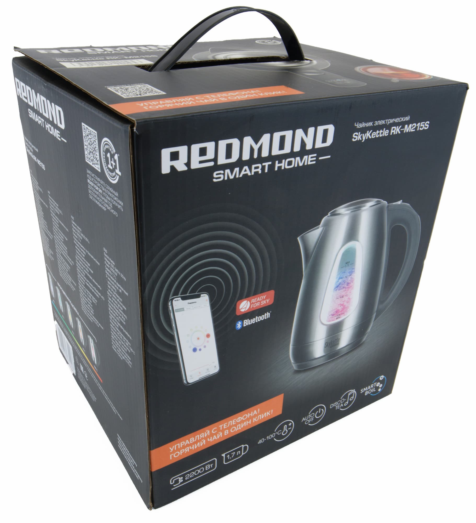 RK-M215S прибыл к нам в небольшой коробке из приятного гладкого картона. Как ни странно, традиционного фото девушки нет — видимо, чайник настолько самодостаточен и крут, что способен привлечь к себе внимание самостоятельно. На упаковке указаны основные технические характеристики прибора, функции, доступные в приложении Ready for sky, а также перечислены другие «умные» приборы Redmond.