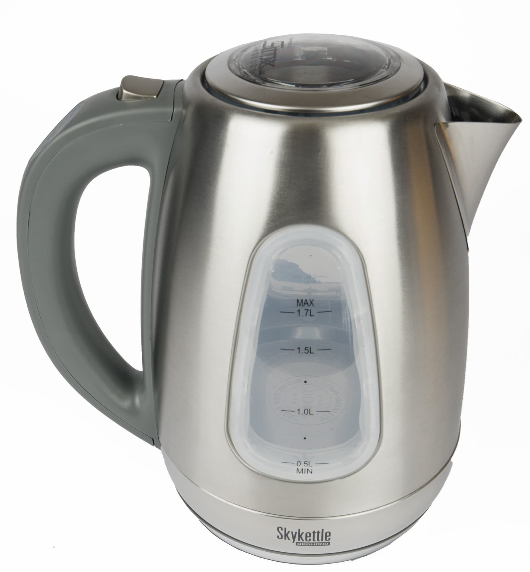 Дизайн RK-M215S сдержанный и, наверно, даже универсальный. Колба выполнена из нержавеющей стали (Redmond заявляет, что это сталь AISI 304 с пониженным содержанием углерода, невероятно устойчивая к окислению и коррозии), два широких окошка — индикатора уровня воды из прозрачного пластика, ручка тоже пластиковая.
