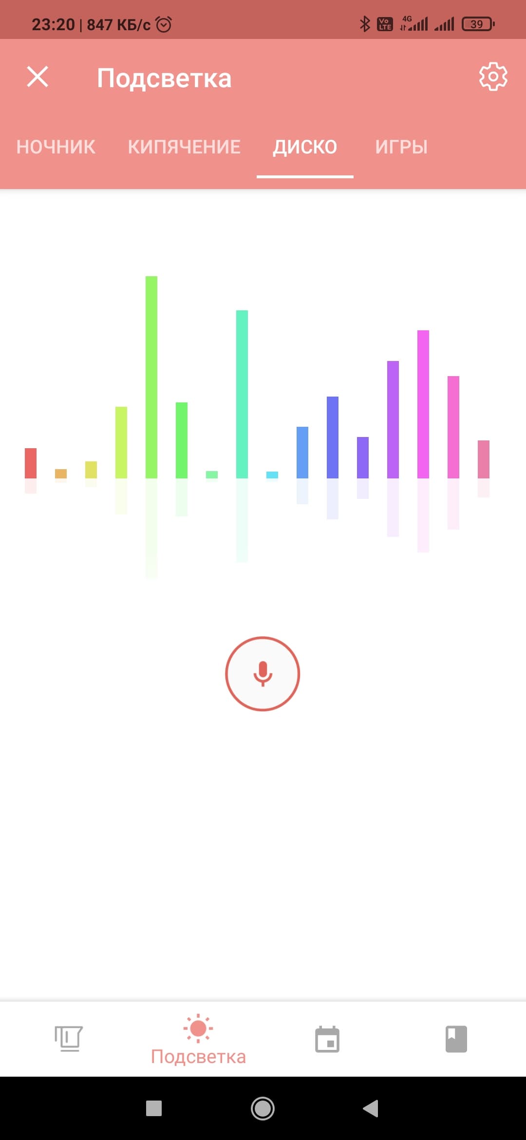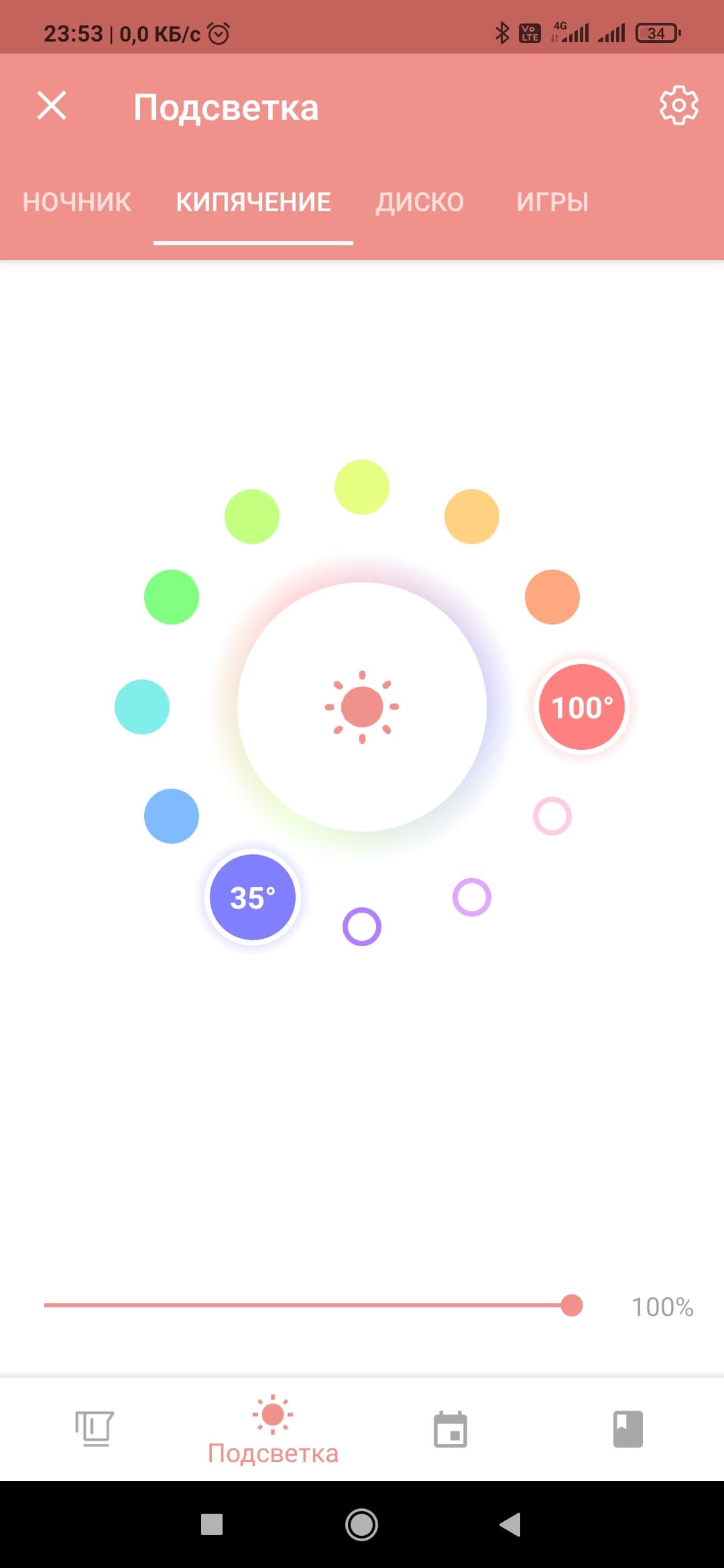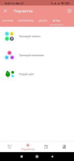 Из приложения также осуществляется управление подсветкой. Можно поставить чайник в режим ночника, установив цвета и период их смены, даже интенсивность свечения в вашей власти. Кроме того, вы можете задать спектр цветов, используемых при нагревании чайника. В этом же разделе подсветку можно вовсе отключить, сдвинув бегунок полностью влево. В режиме «Диско» подсветка мигает разными цветами под музыку — лучше всего эта функция работает, когда композиция звучит из самого телефона. Здесь есть даже игры, довольно простенькие, но когда совсем заняться нечем — можно и цвета поугадывать. Хотя, конечно, этот раздел предназначен для детей.