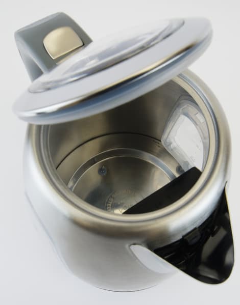 В центре крышки прозрачное пластиковое окошко. Она несъемная, открывается нажатием кнопки, расположенной на ручке, и фиксируется под углом около 80° к крышке, но ее еще можно откинуть градусов на 10. Внутри стандартная картина — металлическое дно, из которого торчит встроенный термометр. Подсветка здесь не круговая — это две лампочки, расположенные под прозрачными элементами корпуса. К носику прикреплен съемный фильтр от накипи, он вставлен в пластиковый держатель, который при желании тоже можно снять. Сетка довольно мелкая, но сам металл выглядит хлипковатым.