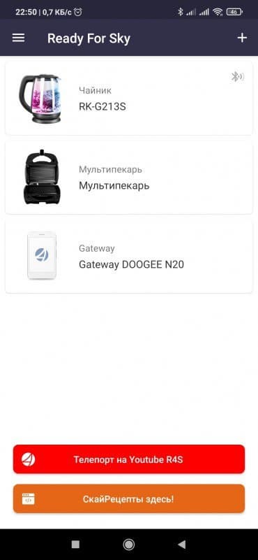 Если вам необходимо управлять RK-M215S с расстояния более 15 метров, доступных Bluetooth, можно настроить удаленное управление через приложение R4S Gateway, но для этого понадобится дополнительный смартфон или планшет, который будет находиться рядом с прибором. В R4S Gateway необходимо зайти под тем же аккаунтом, которым вы пользуетесь в Ready for sky, свайпнуть по экрану сверху вниз, и чайник появится в списке доступных приборов.