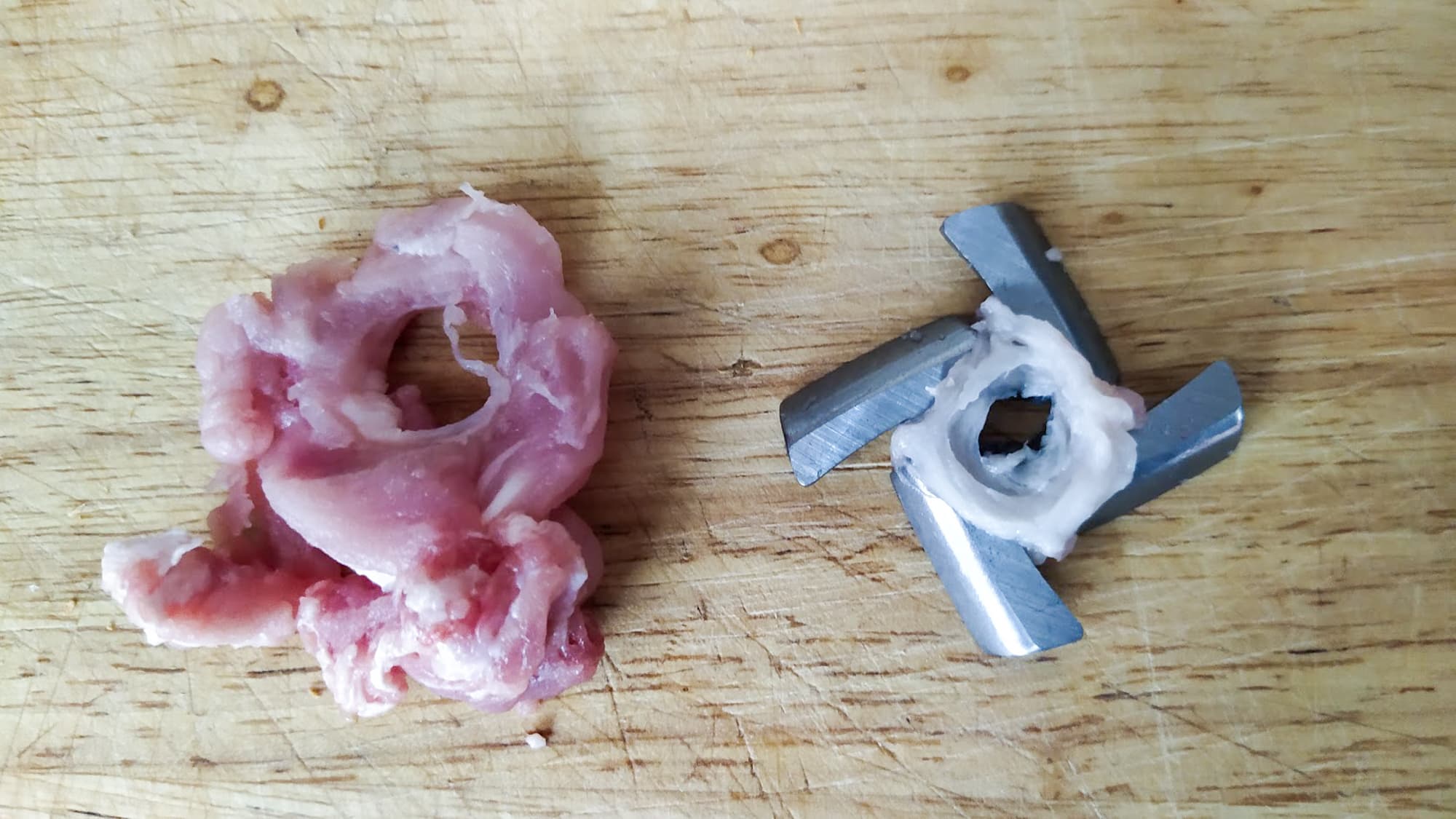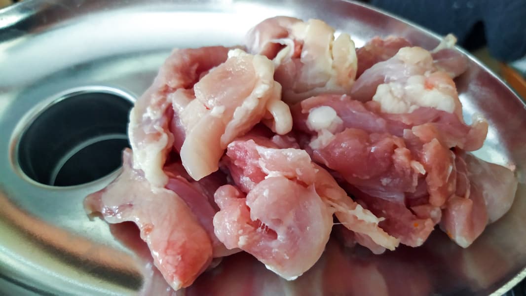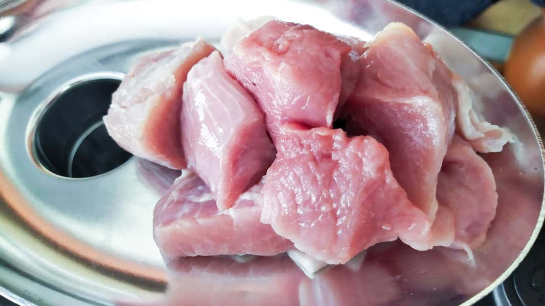 Как обычно, производительность мясорубки мы проверяем на свином окороке. Килограмм мяса мы порезали на небольшие кусочки, ориентируясь на узкую горловину мясорубки.