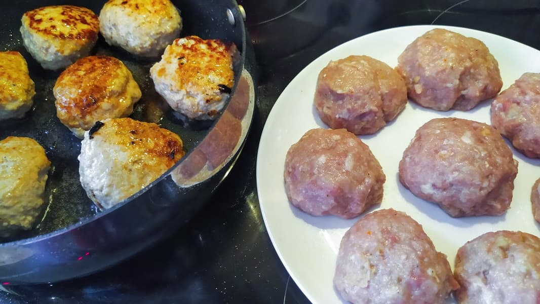 Фарш идеально принимал форму тефтелек, которые не разваливались при обжарке. В дальнейшем мы залили их томатным пюре из первого теста и оставили тушиться.