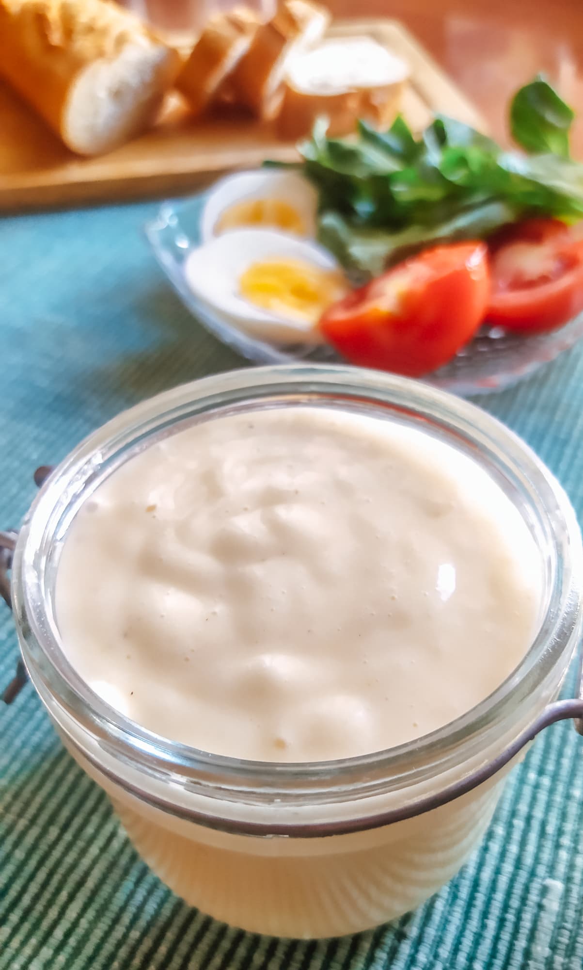 К трем яйцам добавили немного горчицы, соль, перец и щепотку сахара, включили миксер на первой скорости и быстро (но постепенно) перешли к шестой. Венчик взбил содержимое чаши в эмульсию за несколько секунд. Стали вливать масло тонкой струйкой. Когда соус достиг нужной консистенции, добавили уксус. За пять с половиной минут мы получили густой домашний майонез.