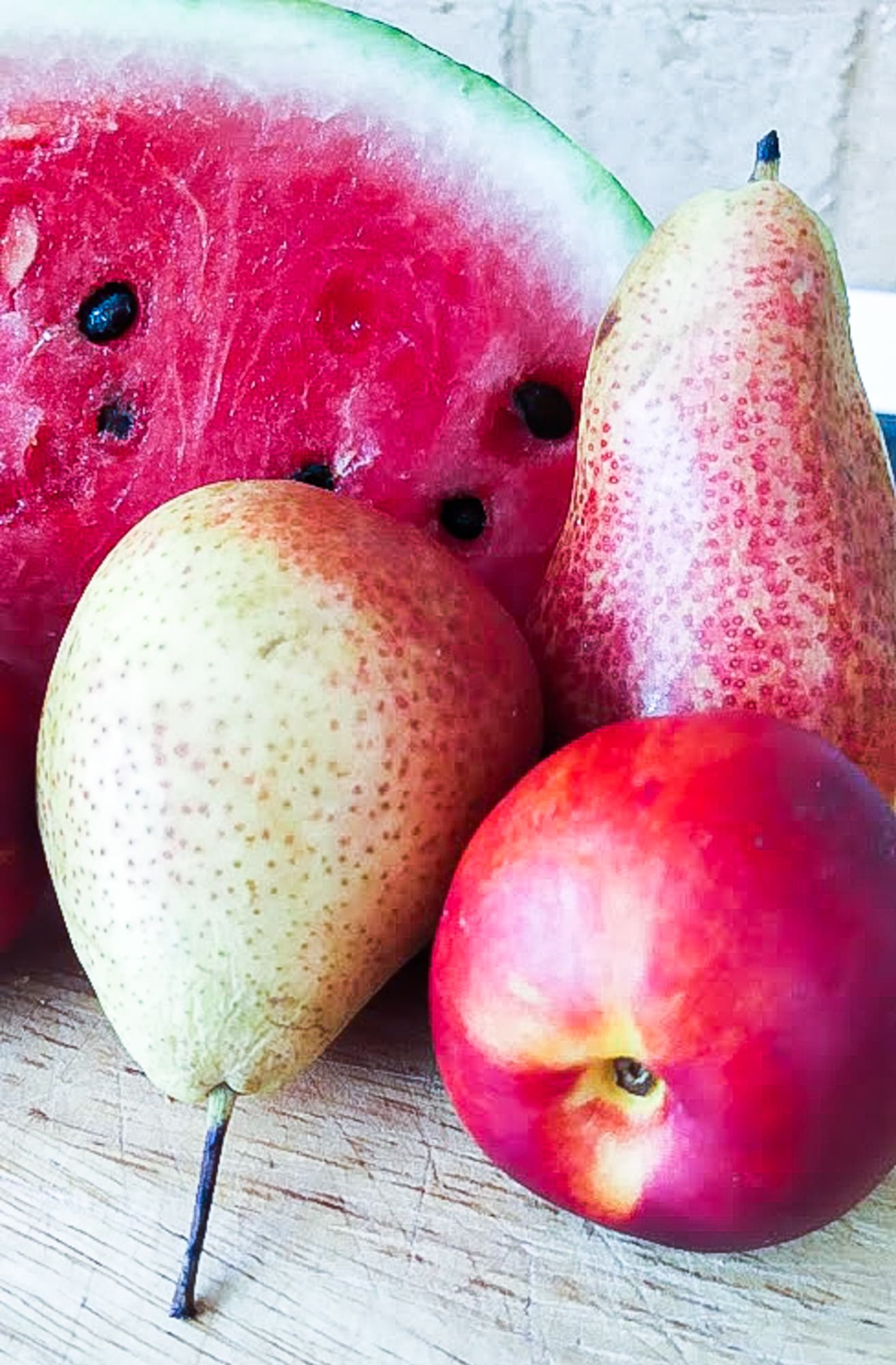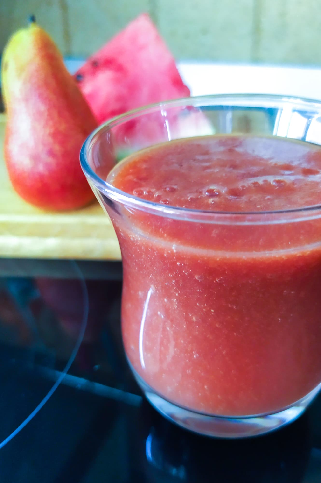 Еще немного помучаем блендер и приготовим в нем летний напиток из фруктов, тем более что на улице нестерпимая жара. Мы взяли арбуз, пару груш и нектаринов. Воду не добавляли — в арбузе ее полно.