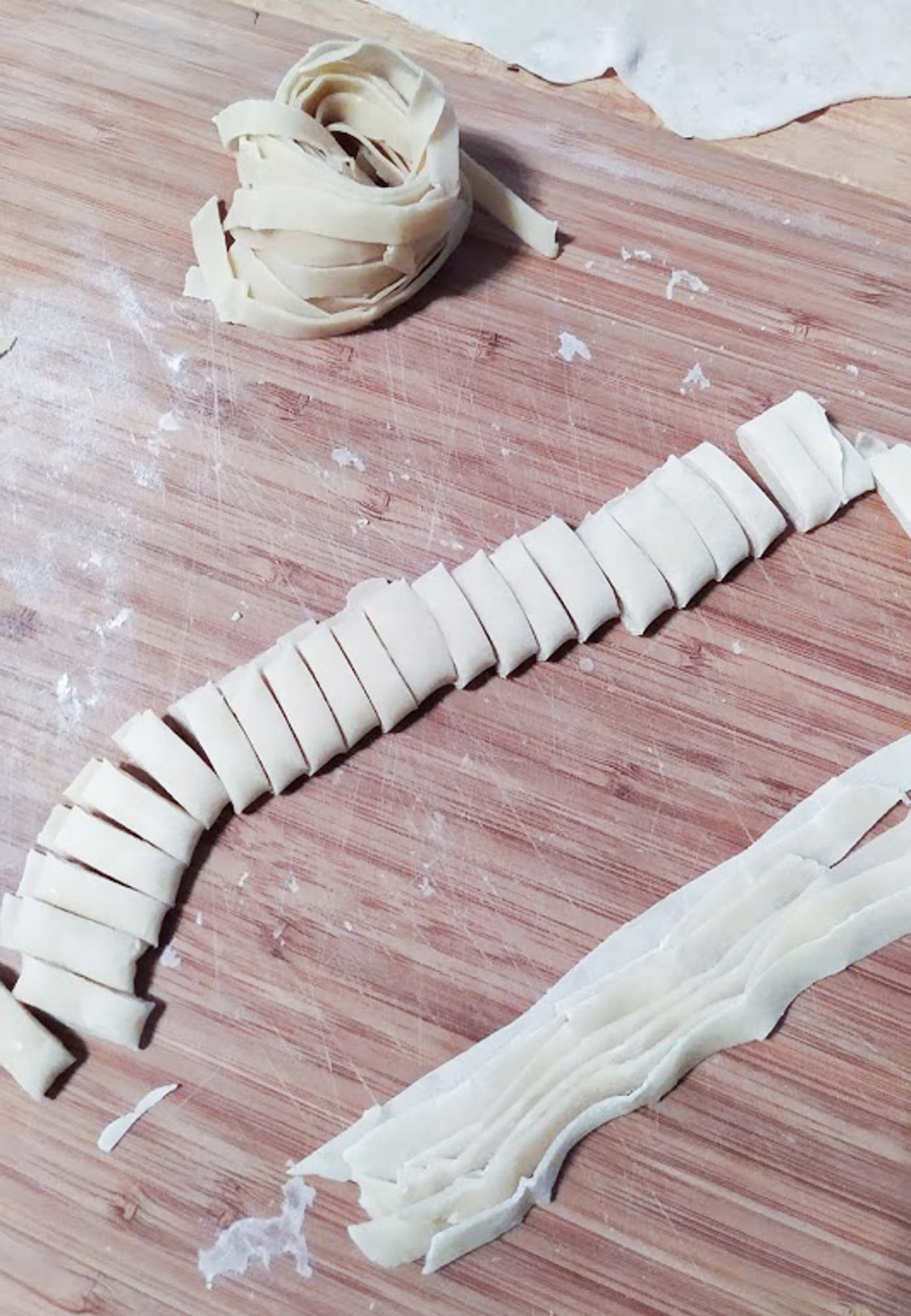 Раскатанные лепешки мы скручивали и нареза́ли — получалась длинная лапша, напоминающая тальятелле. Бо́льшую часть лапши мы засушили, а несколько порций свежей отварили.