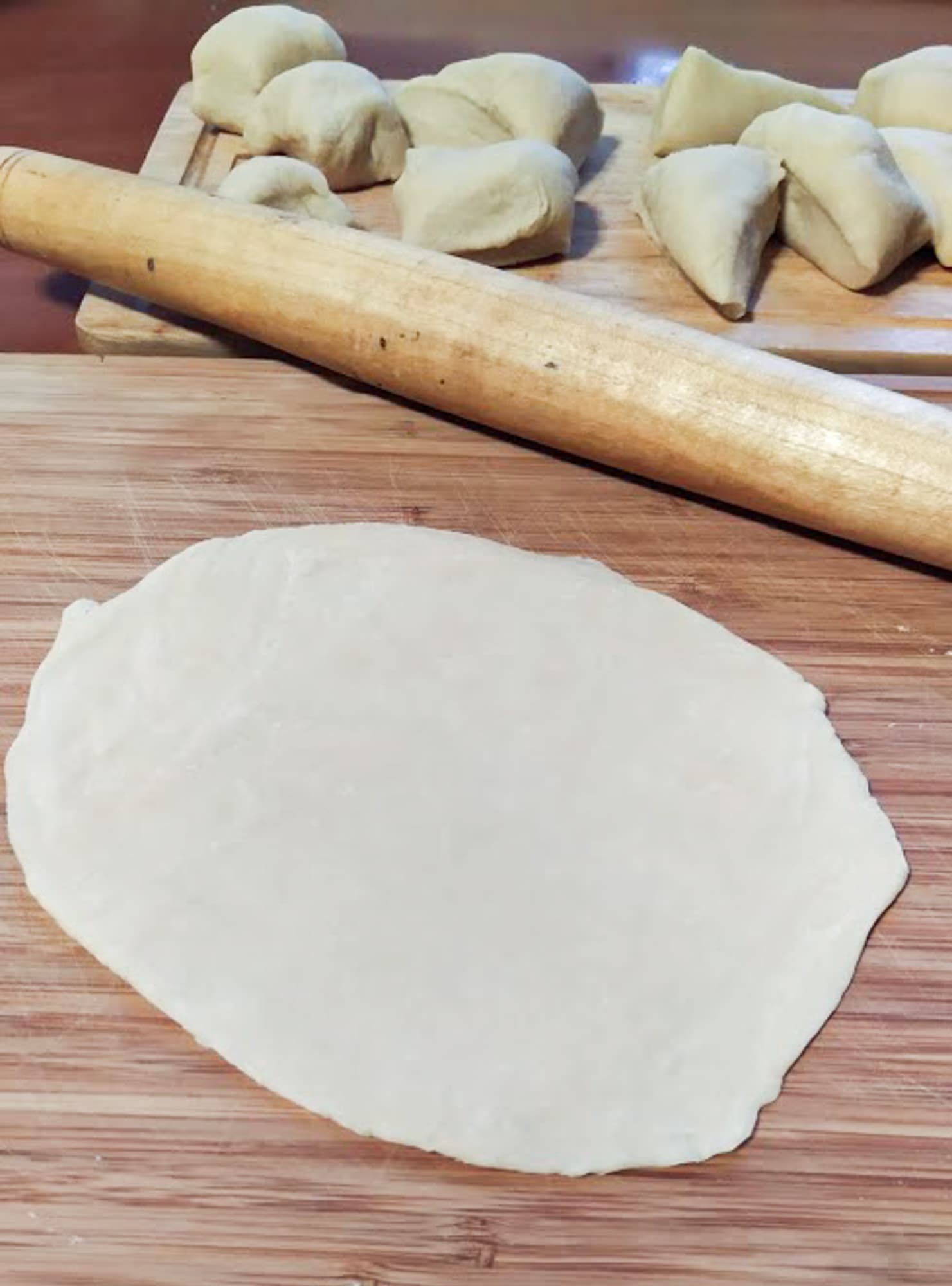 Раскатывали лапшу вручную, практически не присыпая доску мукой: тесто не липло ни к рукам, ни к доске, ни к скалке.