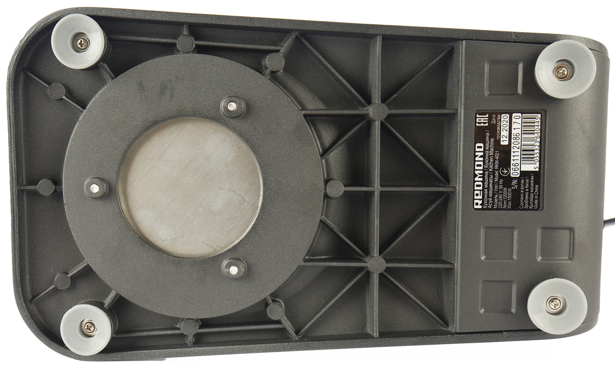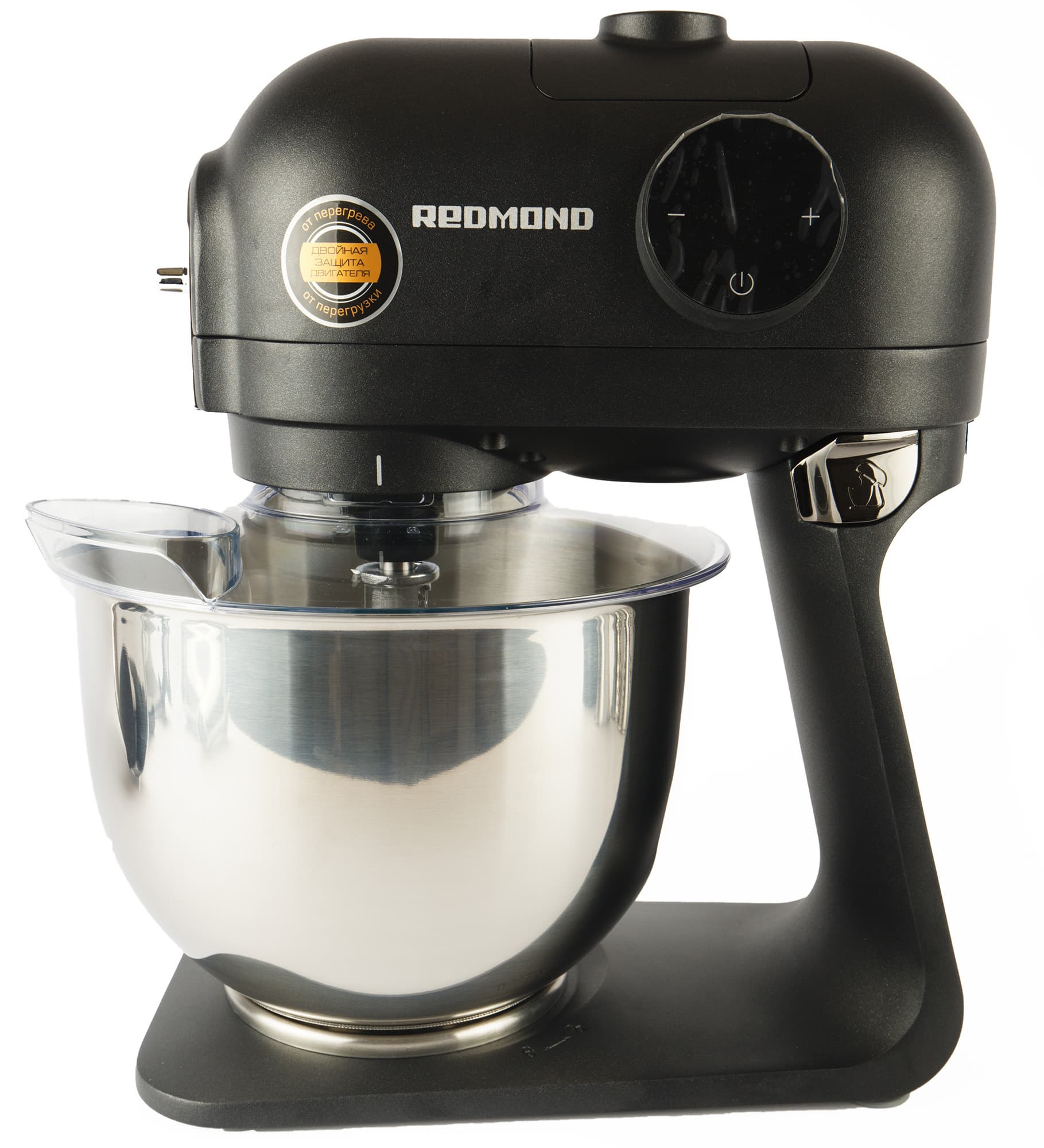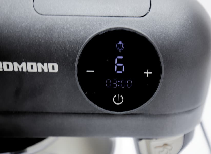 Тяжелый черный корпус Redmond RKM-4021 совсем не выглядит массивным за счет скругленных углов и тонкой ножки, соединяющей моторный блок с подошвой. Выполнен он из приятного на ощупь матового, чуть шершавого металла. Гнезда для мясорубки и блендера надежно закрыты заглушками. Круглая сенсорная панель управления слегка выступает.