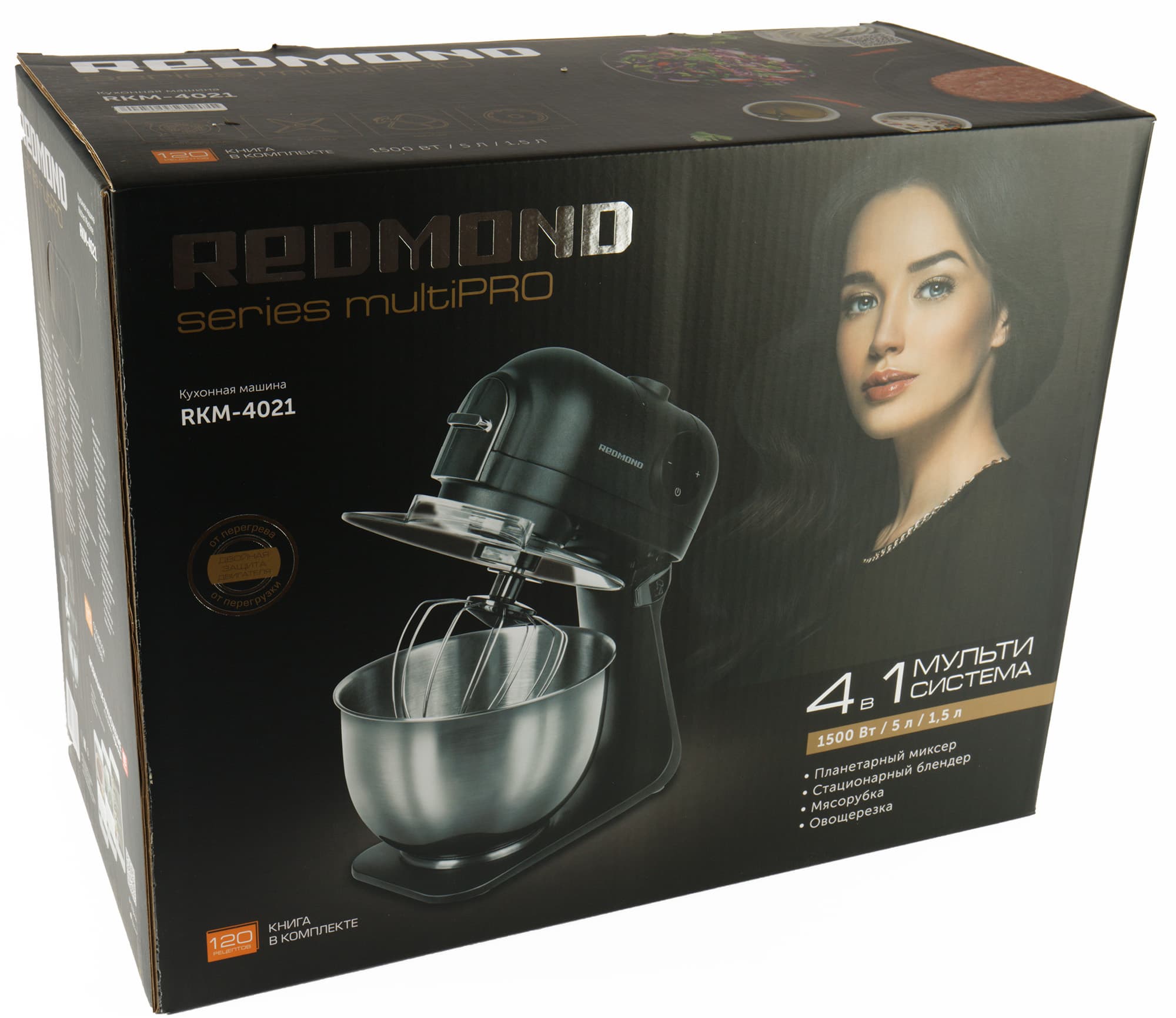 Большая коробка оформлена в традиционном для Redmond стиле: изображение прибора соседствует с фотографией девушки. На других гранях упаковки перечислены некоторые характеристики прибора и представлены примеры блюд, которые можно с помощью него приготовить. Классической ручки на коробке нет, но по бокам имеются прорези для переноски.