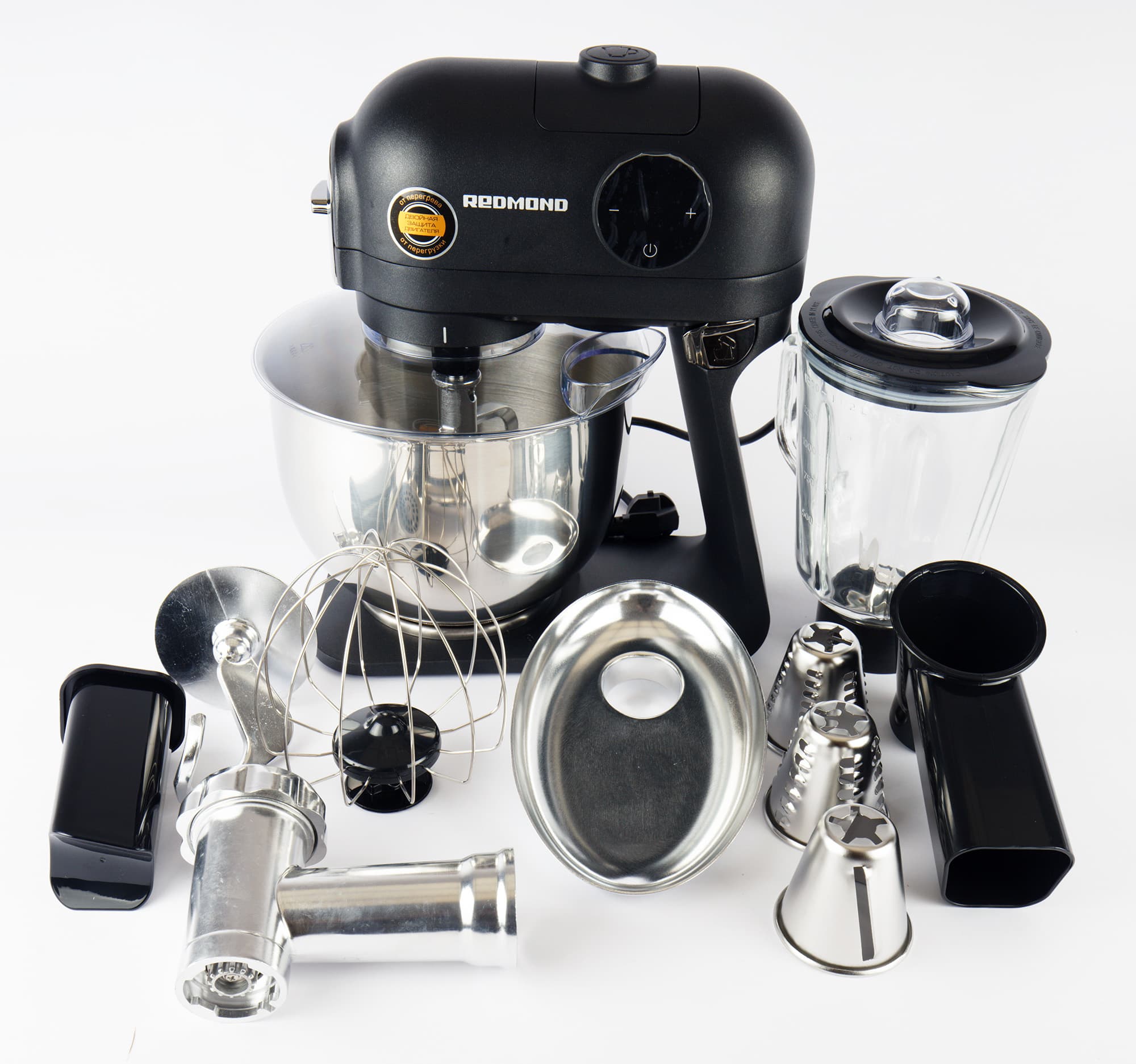 | Насадки в комплекте | планетарный миксер, мясорубка, блендер и универсальная резка |