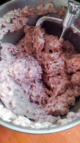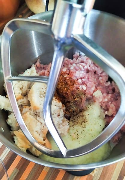Оба фарша, лук и размоченный хлеб отправили в чашу миксера и оставили лопатку вымешивать фарш на 4-й скорости.