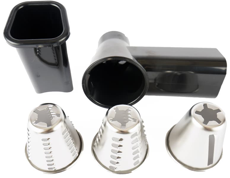 Блок овощерезки крепится на корпусе аналогичным образом. Горловина и толкатель пластиковые. Терки металлические и хорошо заточенные — можно ненароком порезаться. Вставляются в блок они элементарно — просто, простите за тавтологию, вставляются, даже поворачивать не надо. Чтобы терку вынуть, надо чуть повернуть ее против часовой стрелки и потянуть на себя.