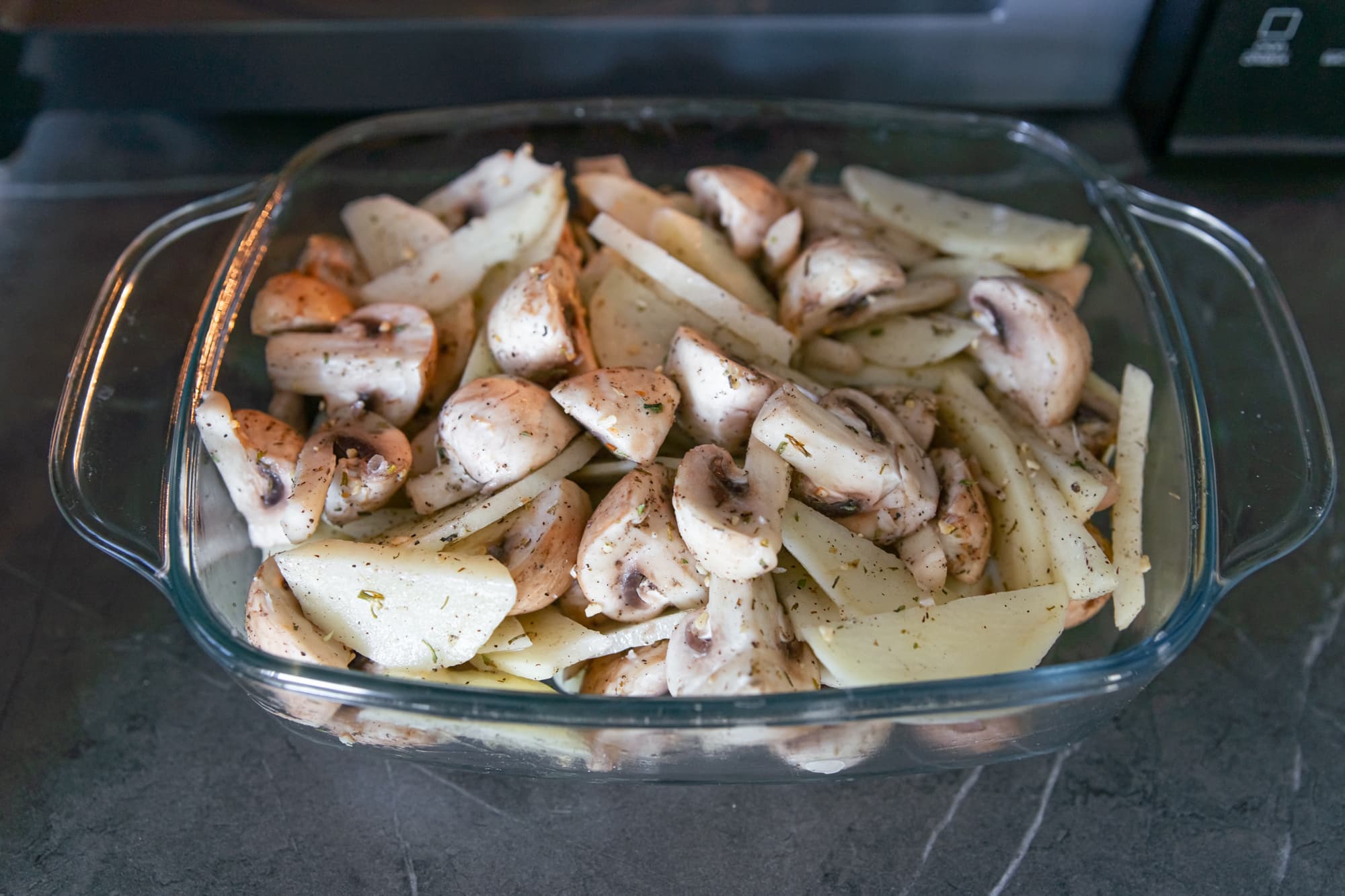 350 г картошки нарезали тонкими ломтиками, добавили 250 г шампиньонов четвертинками, присыпали солью, сухими травами и перемешали вместе с небольшим количеством растительного масла.