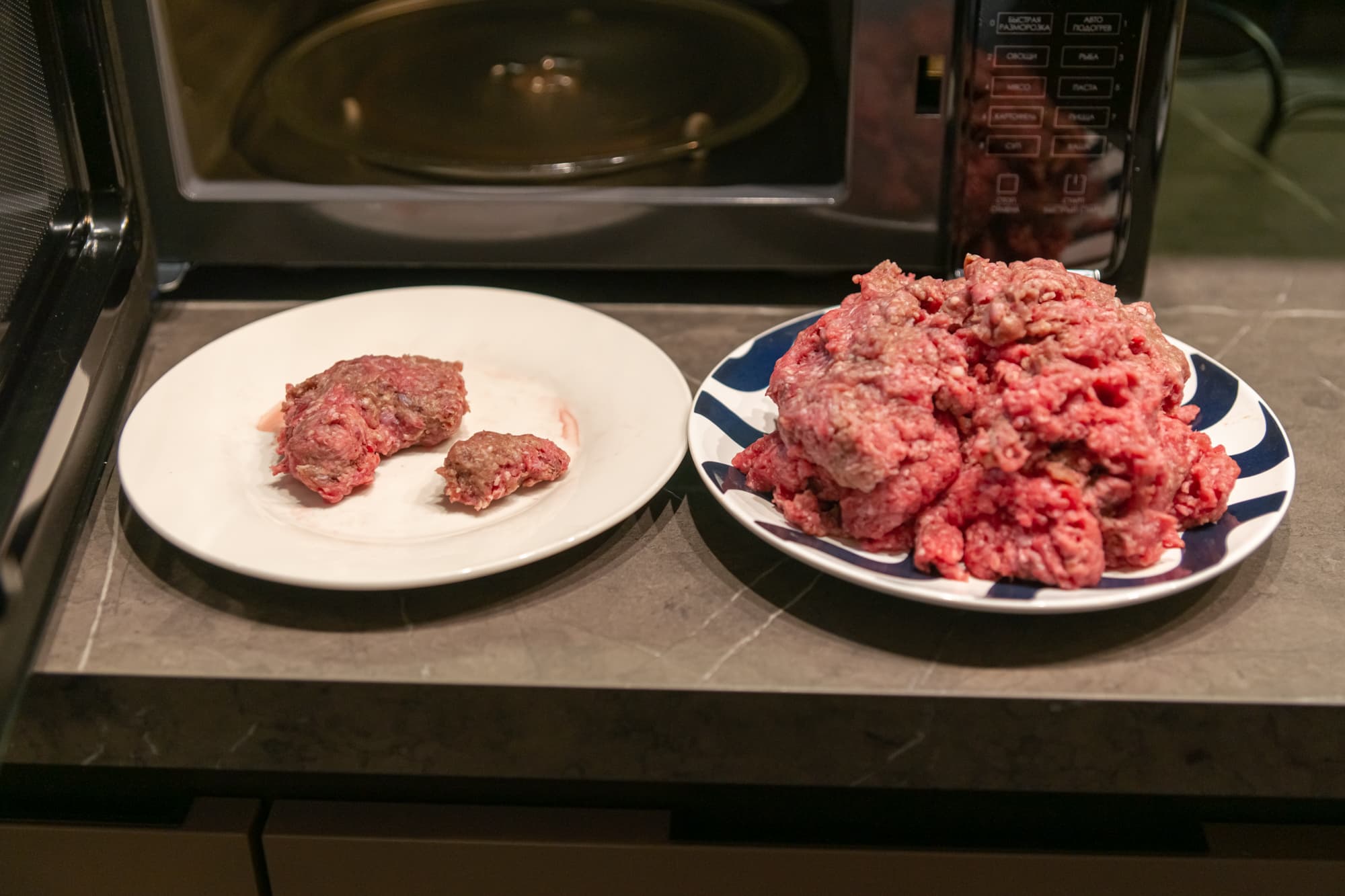 Как только раздался финальный сигнал, достали тарелку и оценили результат. В основном фарш оттаял, но в самом центре остался твердый комочек весом 73 г. Его уже можно было разломать руками, но растаявшим, конечно, не назвать. Ради него одного мы не стали включать печь заново, он и так быстро пришел в себя при комнатной температуре. Запеченных фрагментов в общей массе мы не обнаружили.