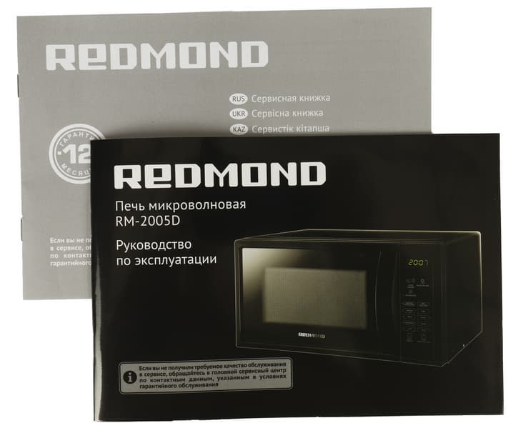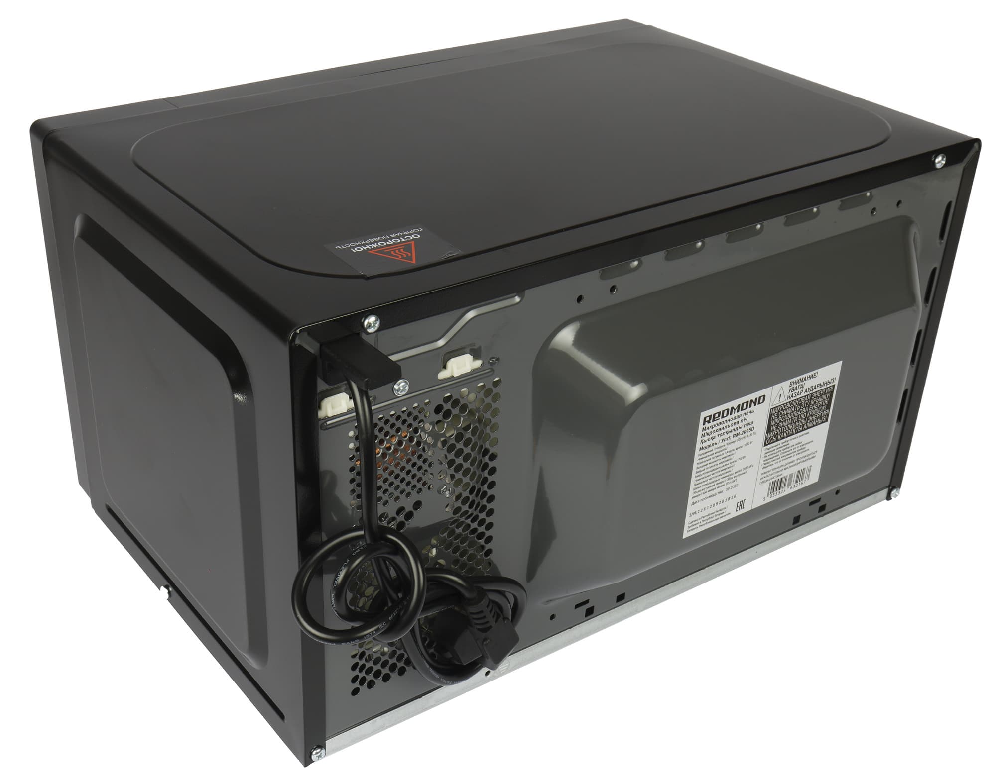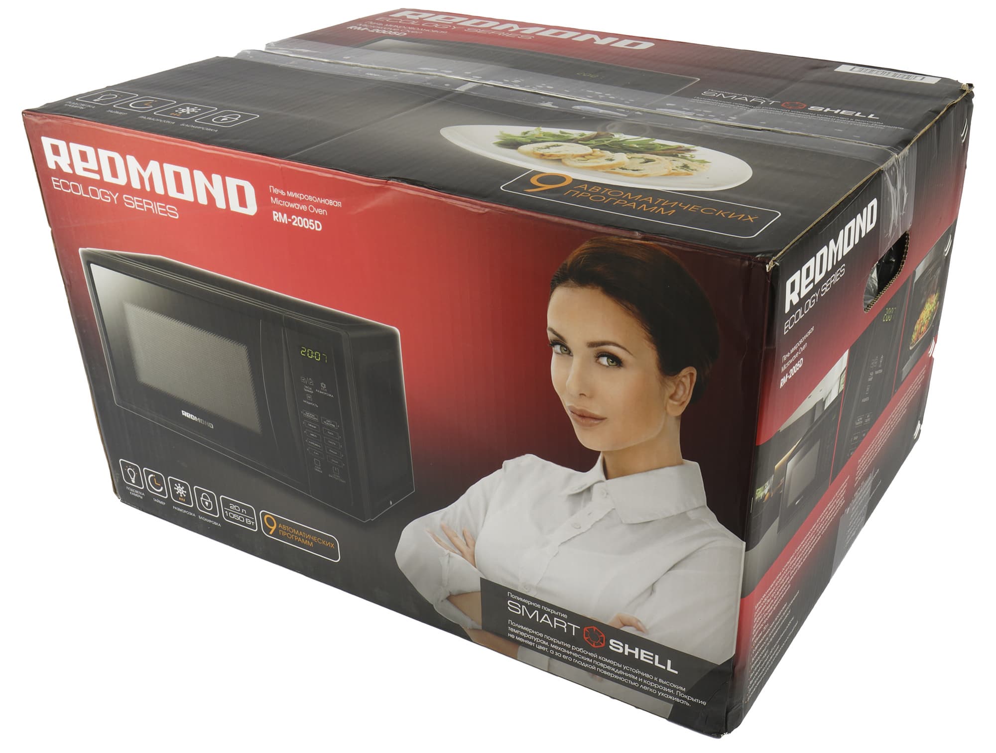 Микроволновая печь поставляется в большой прямоугольной коробке из плотного картона. Стильная упаковка оформлена в лучших традициях Redmond: качественная полноцветная печать, крупные фотографии устройства и достаточное количество информации о приборе, чтобы составить первое впечатление еще до вскрытия коробки. Для удобства переноски на боковых гранях предусмотрены прорези. Внутри прибор упакованный в полиэтилен надежно зафиксирован в неподвижном состоянии пенопластовыми вкладками.