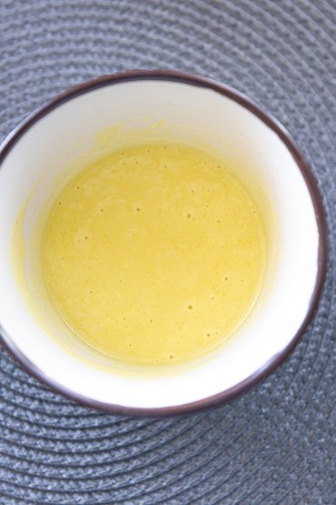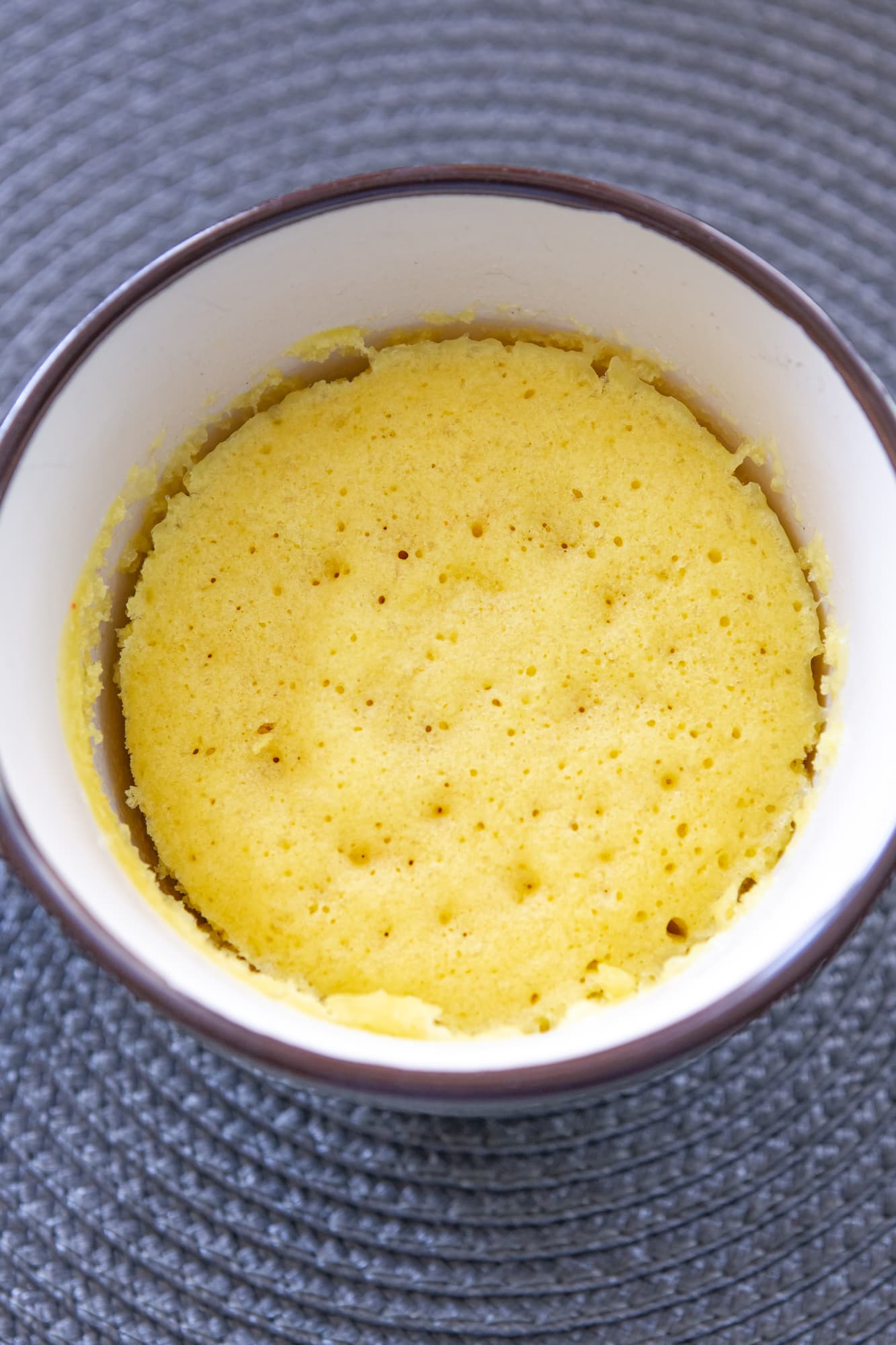 В кружку высыпали готовую смесь, добавили 50 мл воды комнатной температуры и 1 чайную ложку растительного масла. Тщательно всё перемешали и отправили в камеру запекаться. Мы выставили 4-ю мощность микроволн (80%) и отвели прибору 3 минуты.