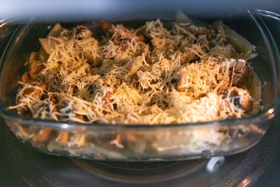 Накрыли стеклянную емкость крышкой и поставили в микроволновку. Включили режим Картофель с установкой веса. На 600 г печь рассчитала 12 минут. По окончании цикла проверили картошку. В основном она была готова, но некоторые ломтики требовали еще немного дополнительного времени. Мы перемешали содержимое блюда, подсыпали сверху тертого сыра и уже без крышки поставили обратно в камеру еще на 2 минуты на максимальной мощности.