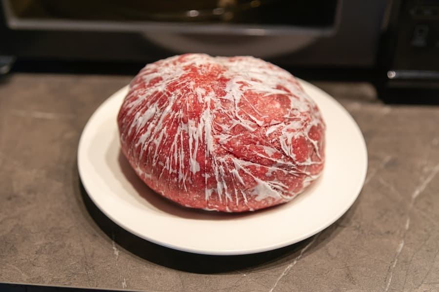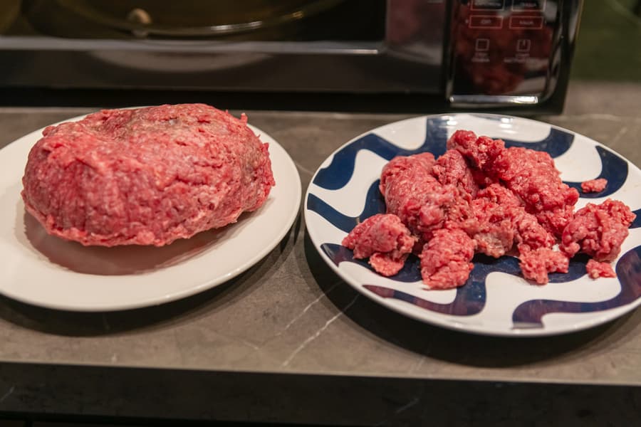 Еще через 10 минут комок со всех сторон равномерно помягчел, мы сняли в общей сложности 350 г фарша и вернули тарелку в камеру.