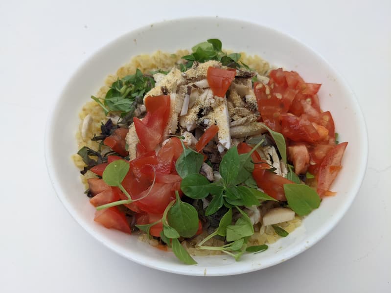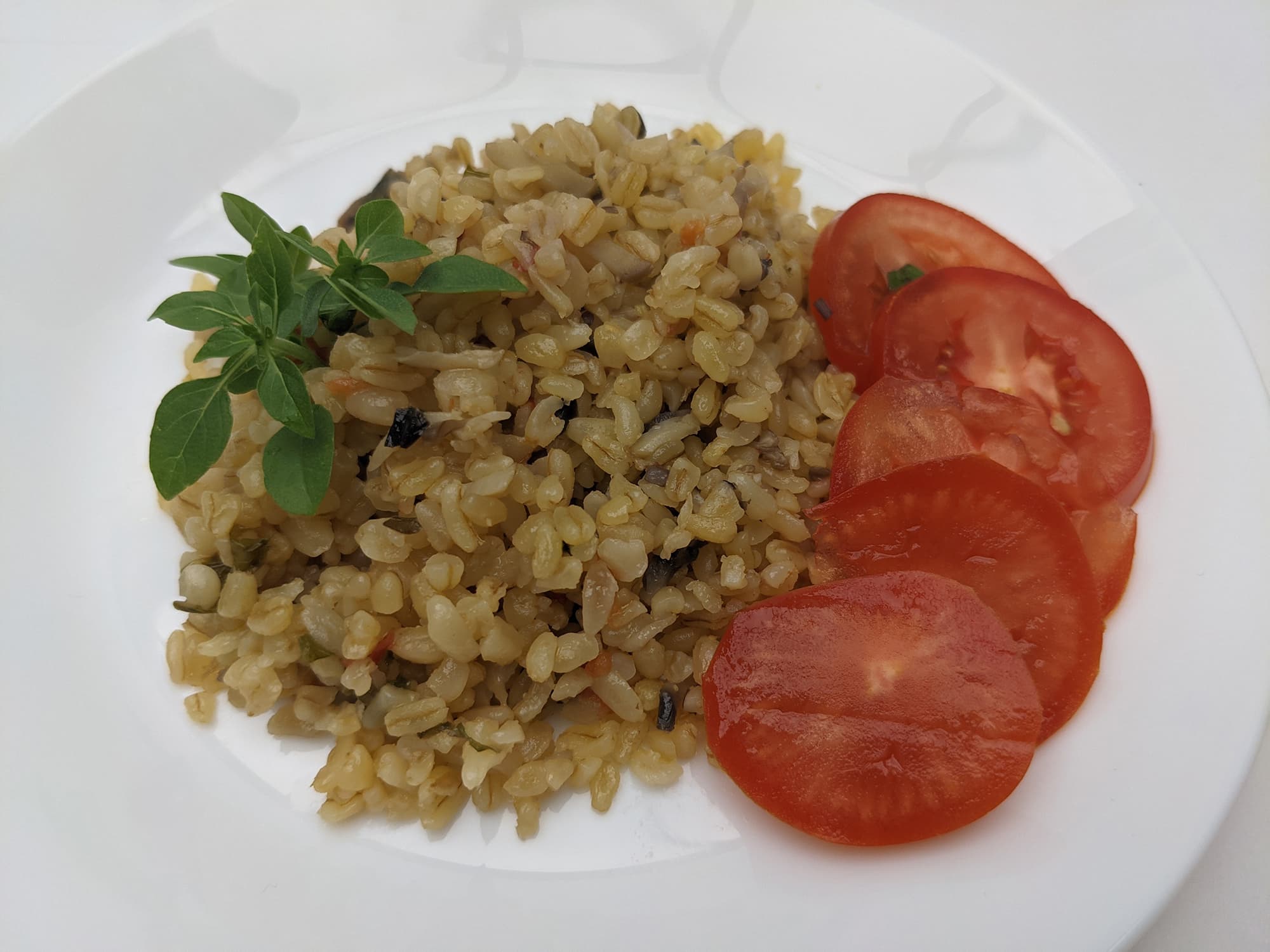 По окончании программы доведенный до полуготовности булгур мы смешали с мелко нарезанными помидорами и шампиньонами, добавили по вкусу соль, пряности и зелень, перемешали и сбрызнули сверху оливковым маслом.