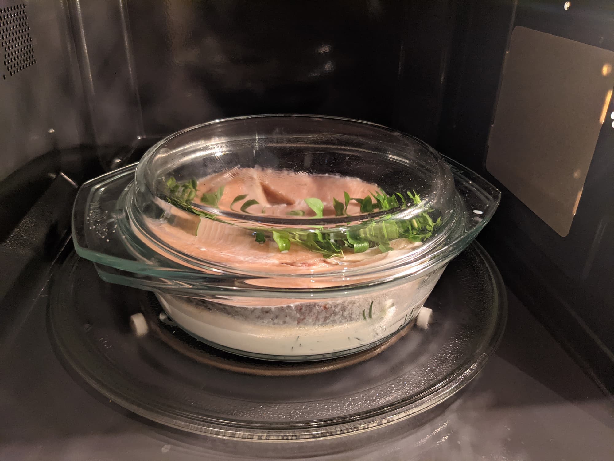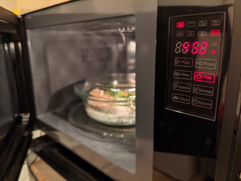 Для дальнейшего приготовления мы выбрали одну из автоматических программ — для рыбы. Максимальный вес продуктов в этом сценарии — 450 граммов. Это несколько меньше, чем содержимое емкости с учетом добавленных сливок, но рыбу лучше недодержать, чем передержать. Микроволновка рассчитала, что на такое количество продуктов ей потребуется 9 минут.