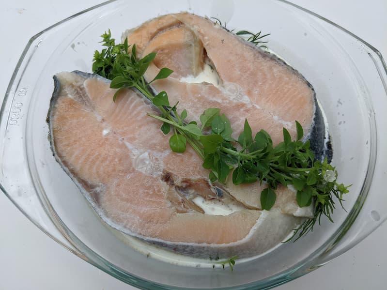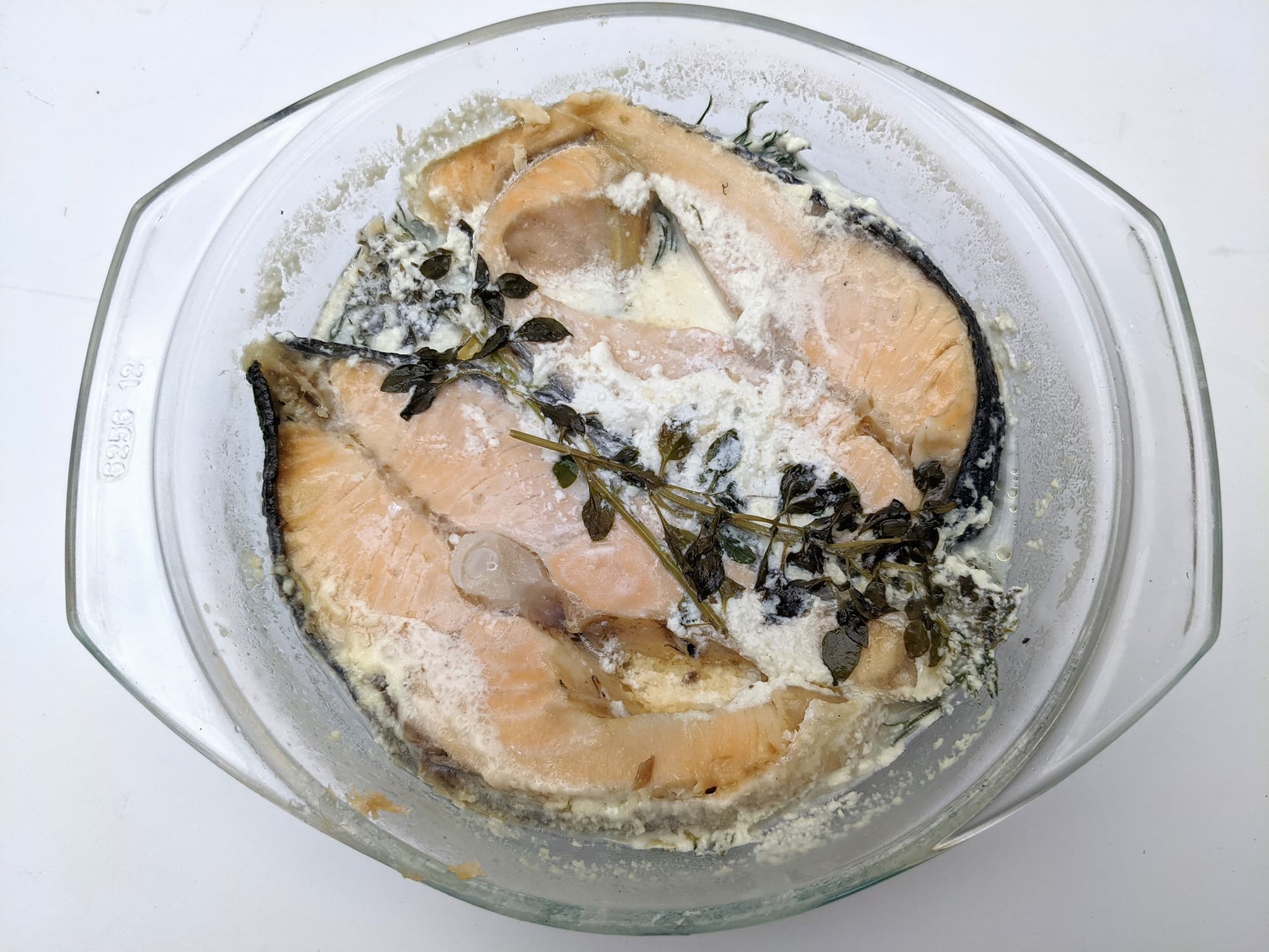 Размороженную семгу мы переложили в стеклянную кастрюлю, уложив ее на подушку из пряных трав, чуть присолили и залили десятипроцентными сливками приблизительно до середины.