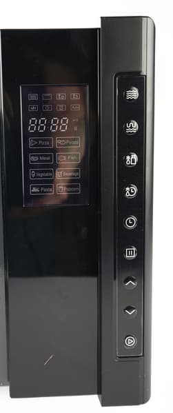По правому краю передней панели вертикально расположены девять мембранных кнопок. Светодиодный дисплей чуть левее, под дверцей, в покрытии которой для него оставлено прямоугольное окошко. Кнопки устройства нажимаются легко и четко, их нажатие сопровождается звуковым сигналом. На каждой нарисована интуитивно понятная иконка.