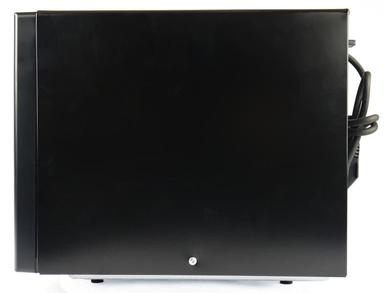 Вентиляционные отверстия есть также на левом боку и задней стенке. На тыльной стороне есть шильдик с серийным номером, информацией о приборе и рядом предупреждений. Электропровод выходит из правого верхнего угла задней панели, рядом с ним — предохранительный упор, не позволяющий придвинуть устройство слишком близко к стене и повредить его или поверхность.