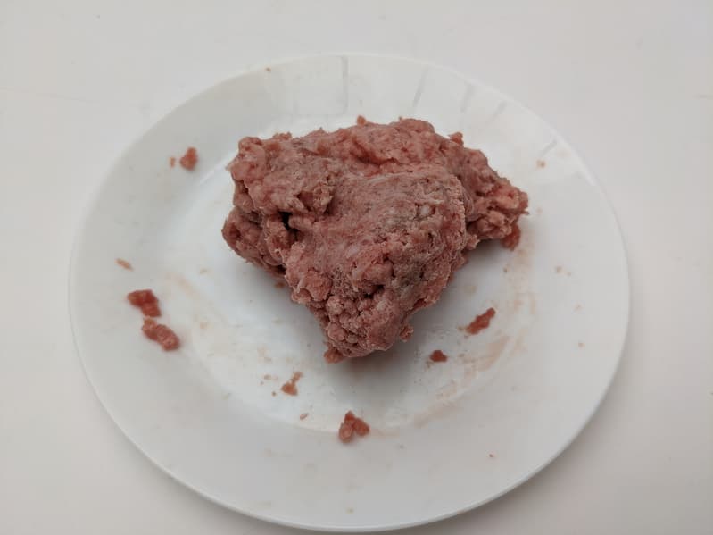 С учетом того, что мясо уже было частично обработано микроволнами, мы решили извлечь его чуть раньше — через две минуты — и оказались правы. Фарш оказался идеально размороженным, не потек, а признаков коагуляции белка мы не обнаружили.