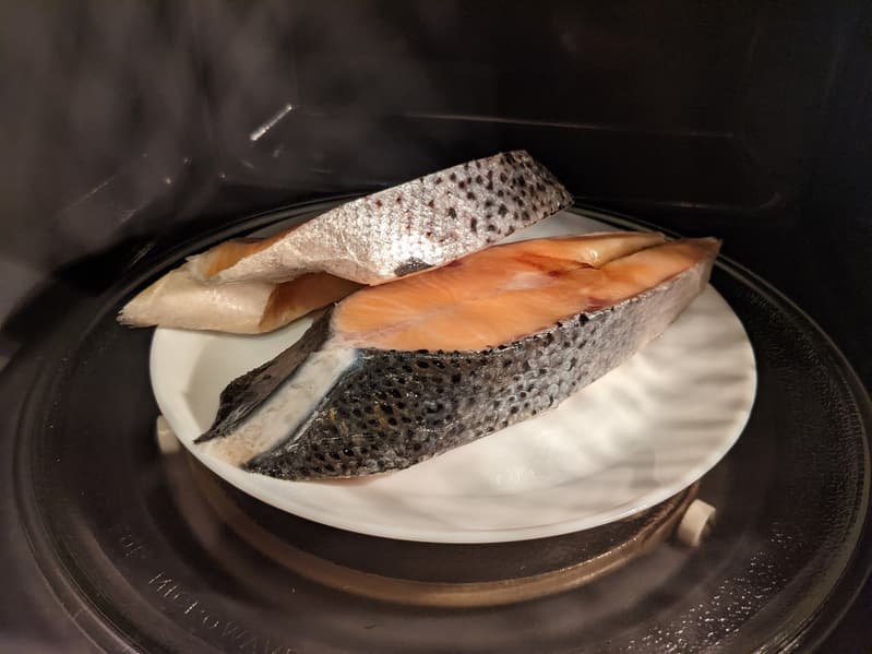 В одном из предыдущих тестов мы размораживали мясной фарш, а в этом попробовали так же обойтись с рыбой. Два стейка сёмги общим весом чуть больше 400 граммов поместили в печь и включили соответствующую программу по этому весу. На это ушло 7 минут 20 секунд.