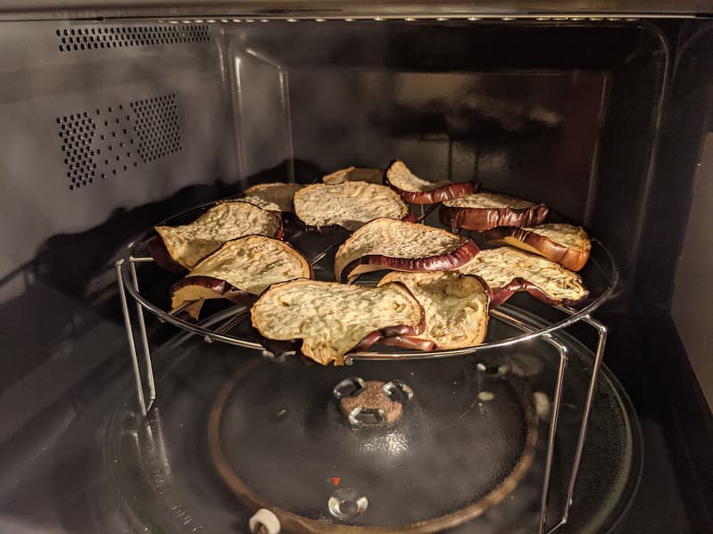 Средних размеров баклажан мы, не очищая, нарезали поперек, разложили кружочки на решетку для гриля и включили комбинированный режим. Напомним, что их у этой модели два, и мы выбрали программу С2, которая распределяет мощность микроволн и гриля в соотношении 36/64.