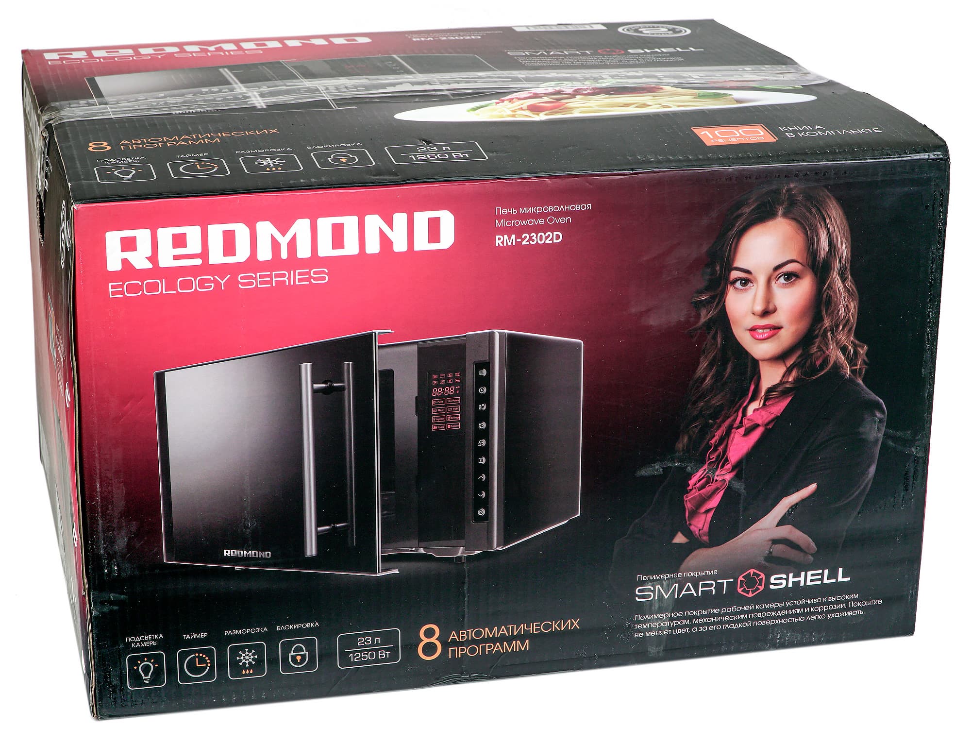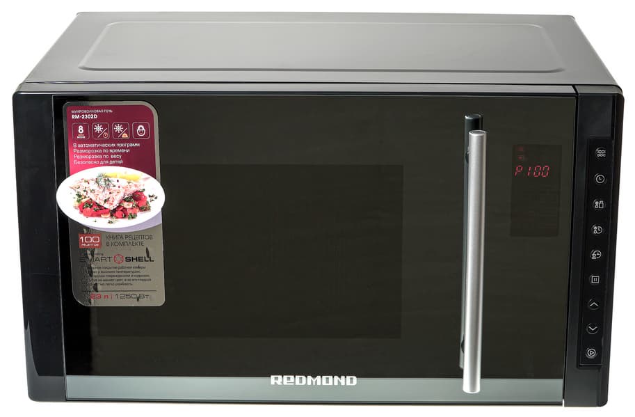 Прежде всего, СВЧ-печь Redmond RM-2302D отличается элегантным внешним видом. Помимо этого она оснащена рядом интересных функций, некоторые из которых, несомненно, окажутся полезными: быстрый старт, блокировка кнопок, 8 автоматических программ приготовления, разморозка по времени и весу и поэтапное приготовление. В приборе нет ничего лишнего, и есть всё самое необходимое. Что ж, в ходе тестов мы проверим, удобно ли пользоваться печью и насколько хорошо реализованы ее дополнительные функции.